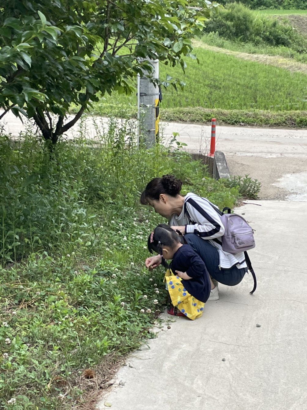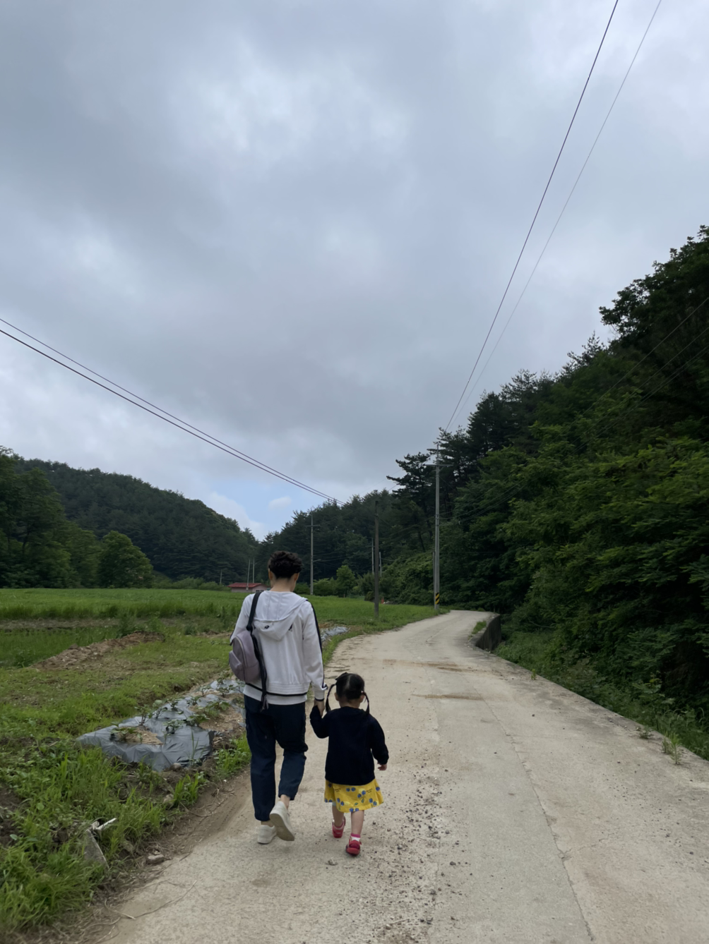 여기서부터는 도로가 포장이 안 돼서 걸어가야 돼. 아빠가 말했다. 아이들 데리고 차에서 내렸다. 산비둘기 소리, 뻐꾸기 소리, 맹꽁이 소리, 소울음소리. 영락없는 시골 동네였다. 나는 생후 2개월 된 아기를 아기띠에 매고, 동생 내외는 두 돌 된 아이 손을 잡고, 나머지 내 세돌 된 첫째 딸은 우리 엄마 손을 잡고 구비구비 아빠가 찜한 땅을 보러 갔다.