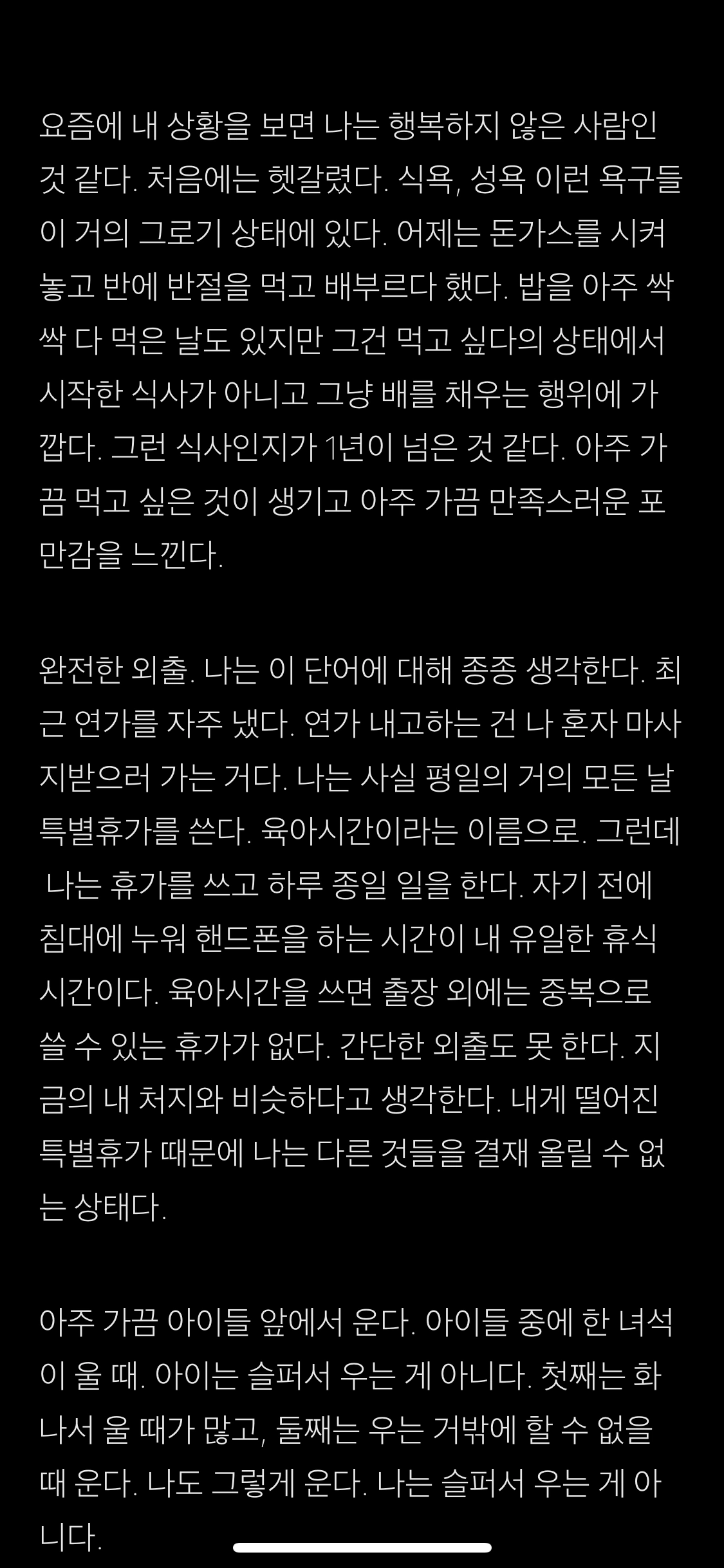 위독해서 당장 임종을 봐야 하는 가족들에게 급히 전화가 왔다고 하는 순간까지도 나는 내 식솔들 챙기느라고 발이 묶여있었다. 내 발이 묶여있는 것, 그게 내 우울의 원흉이라고 생각했던 것 같다. 그도 그럴 것이 최근엔 이런 글조차 우울감으로 인해 쓰지 못했고 막상 쓰면 이렇게 술술 쓰지만 쓰지 못할 것이라는 생각에 사로잡혀 시작을 하지 못 했다.