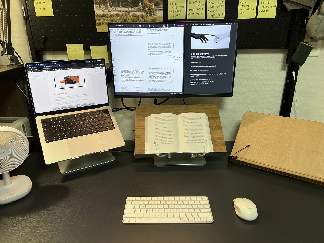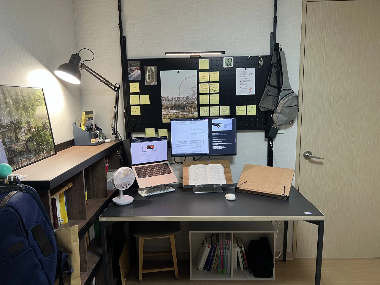 제가 글을 쓰는 공간, ‘공부방’입니다. 글쓰기 핵심 장비로는 맥북(노트북), 모니터, 키보드, 마우스, 높이조절 독서대가 있습니다. 기분용 장비로는 조명, 타공판, 액자가 있습니다.
