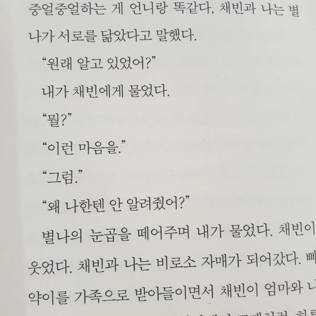 소설의 틀은 채빈과 예빈 자매가 함께 살게 되는 과정과 별나와 유나를 통해 진짜 가족이 되는 이야기라고 생각한다. 다만 이 틀 내에서 ‘짐승’과도 같았던 이가 ‘사람’으로 자라나고, ‘사람’들이 얼마나 ‘짐승’ 같은 모습을 보여줄 수 있는지. 정말 몰입감 있게 보여줬다. 어떻게 보자면 말장난 없이 정말 진지한 소설이지만, 끌어가는 힘은 넘쳐서 순식간에 읽게 되었다. 물론 읽는 나에게 분노를 주는 순간도 있었지만.