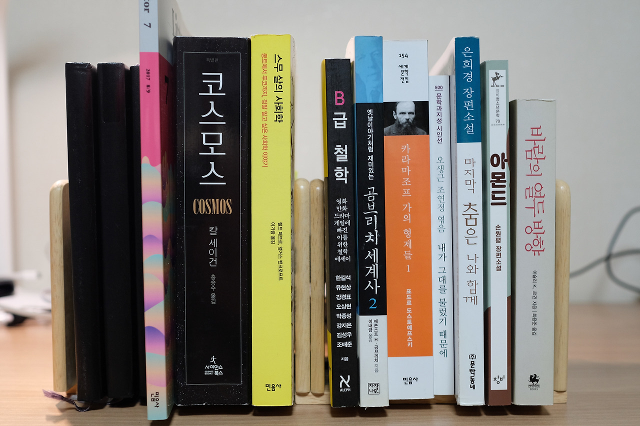 인문학은 문학, 철학, 역사로 나눴다. 문학은 거기서 일반문학과 장르문학으로 한번 더 나눴다. <아몬드>, <마지막 춤은 나와 함께>의 일반문학군은, 10월 독서모임에 참석하기 위해 읽어야 할 책들이다. 최우선적으로 읽을 책이다. <아몬드>는 남녀노소 가리지 않고 인기가 많은 책인데, 사실 표지가 마음에 안 들어서 구하려고 하지 않았다. 책을 사는 데 표지도 큰 몫을 차지하는데 뚱한 표정으로 바라보는 남자가 마음에 안 들었다. 은희경의 <마지막 춤은 나와 함께>는… 사실 생각지도 않았던 책이다. 대학생 때 <소년을 위로해줘>를 몇장 읽고 바로 덮어버렸던 기억이 있기 때문이다. 문장을 꼼꼼하고 아름답게 쓴다는 평이 있지만 참을성 없고 무식한 나는 읽기 힘들었다. 독서모임을 하다보면 평소에는 읽지도 않을 책을 읽게 된다는 장점이 있는데 벌써 이럴 줄은 몰랐지. <까라마조프가의 형제들>은 아이유 따라서 읽으려고 놓았다. 이번 분기에 1권이라도 끝내려고 한다. 화이팅!