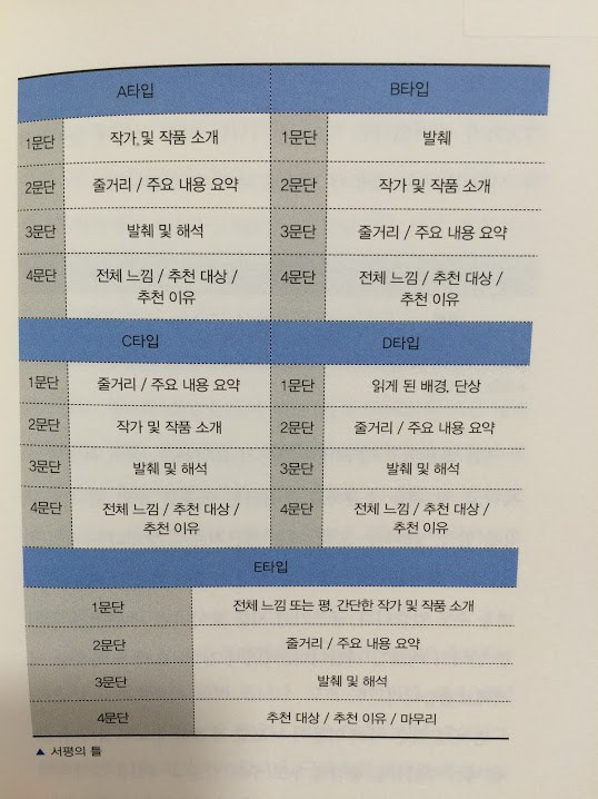 그런데 독후감과 서평은 어떤 차이가 있을까. 저자는 전자를 책 읽은 소감으로 나의 느낌을 표현하는 글로, 후자를 객관적인 정보나 책 내용이 주가 되는 글이라고 구분하였다. 물론 서평도 자신의 생각이 들어가나 전체의 1/3 정도만 주관적 평가가 들어간다고 말한다. 이 책은 책을 읽고 나서 생각을 정리해보고 싶은 이들을 위해 간단한 로드맵과 일정한 틀을 소개한다.