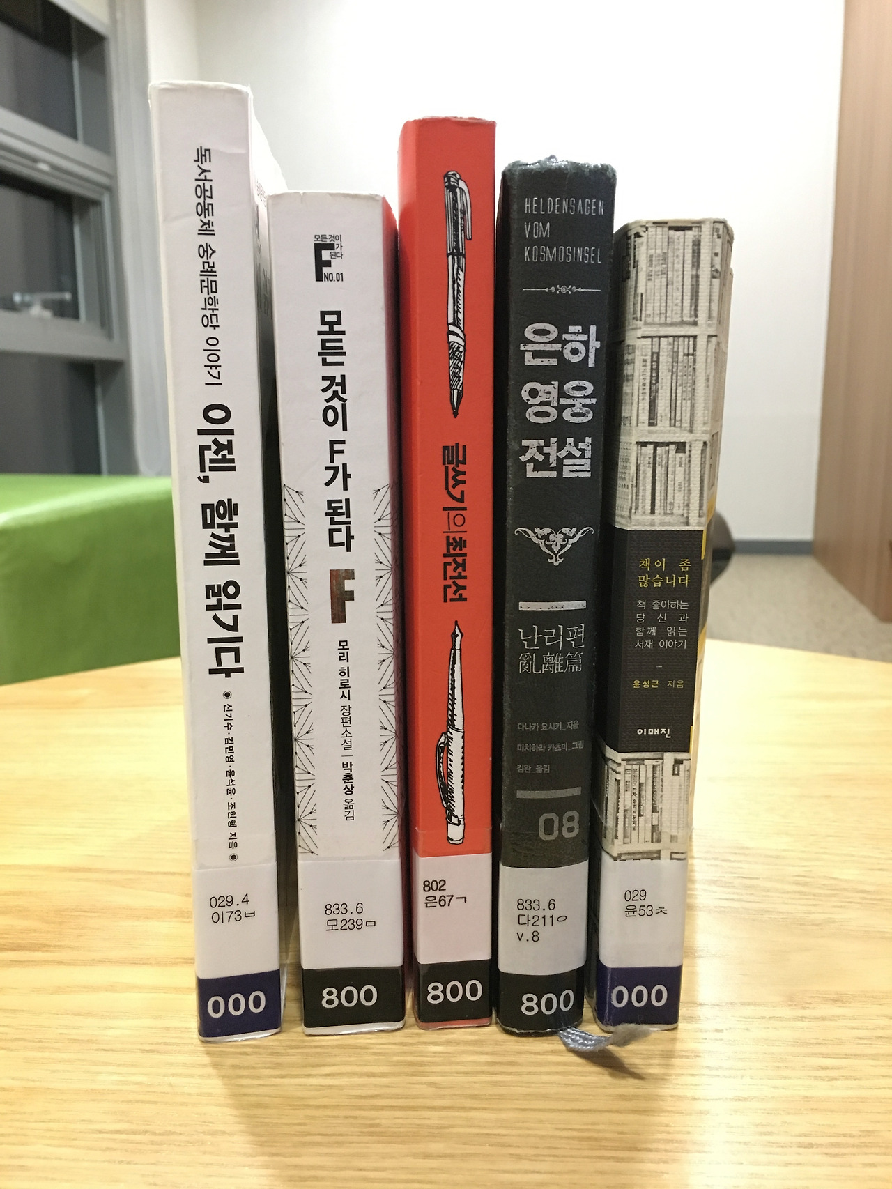 이걸로 의도치 않게 - 여느 때와 마찬가지로 충동적으로 대출 한도인 다섯 권을 꽉 채웠다. 한 주에 한 권도 읽기 힘든 나로서는… 이 책들이 기숙사와 도서관 사이를 왔다 갔다 하면서 나를 힘들게 할 짐이 되는 느낌이다. 크헝헝.