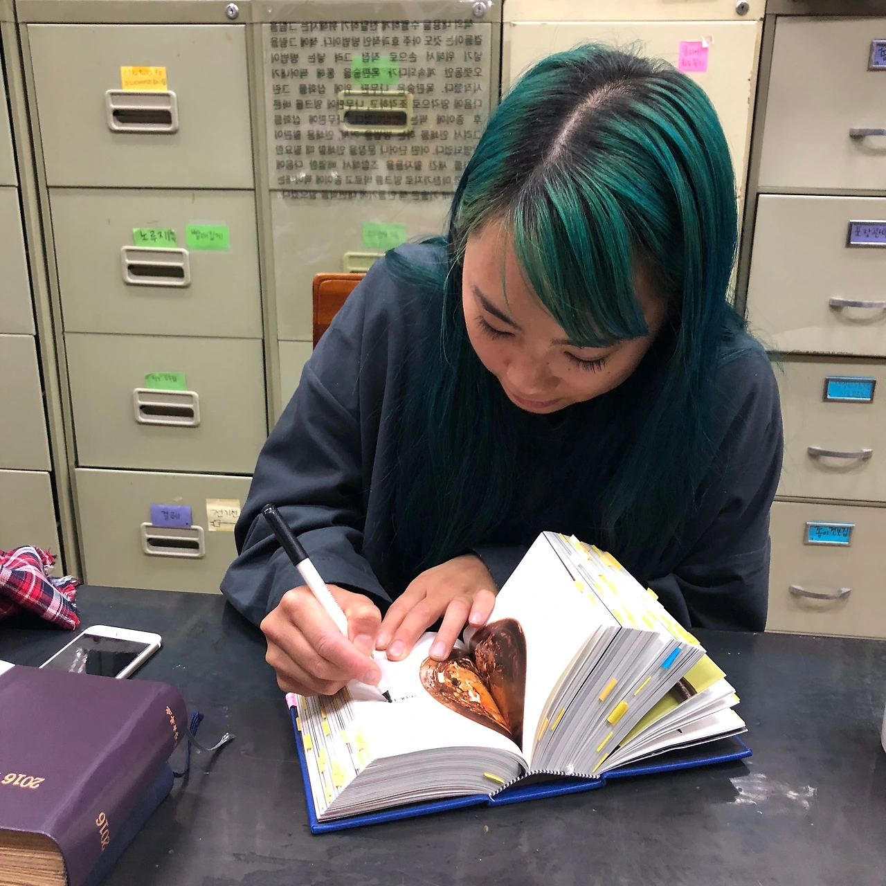 오사카에서 만났을 때 그 친구는 이스라엘로 유학을 간다고 했는데 이번에는 십일월 부터는 대만의 레터프레스 공방에 인턴쉽 과정으로 간다고 했다. 그 이후에는 제본학교에 갈 지 어떻게 할 지 고민이라고 했다. 영어를 잘 하기에 따로 공부를 한 것이냐 물으니 교환학생으로 뉴욕에서 3년 정도 있었다고 했다. 나는 언어도 안 되면서 뭐가 그렇게 궁금했는지 손가락을 정신없이 움직였다. 내가 많은 질문을 한 탓인지 그 친구도 나에게 몇 년 동안 이곳에 있었는지 선생님과 둘이 일을 하는지 등등을 물어 왔다. 우리가 그렇게 침묵 속에 손가락이 바쁜 대화를 나누는 동안 바깥 날씨는 태풍이 올 것 같은 날씨로 변해갔다.