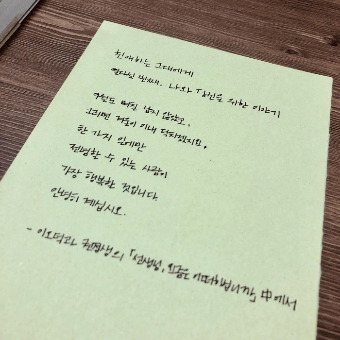 저희가 이렇게 편지를 쓰기 시작한 것도 15주가 되어 갑니다. 네 달 가까이 되는 시간이 짧은 것은 아니지만 그렇다고 마냥 긴 시간도 아닌데 이제 일요일이 제게는 편지를 쓰거나 받는 날이 되었습니다. 그대에게 편지를 받는 날에는 몰라도 제가 쓰는 날에는 어떠한 일을 하거나 약속을 잡는 일도 피하게 됩니다. 편지만 봤을 때는 그냥 슥슥- 써 내려간 것처럼 보이지만 그간의 편지를 쓰기 위해 저는 꽤 많은 시간을 생각하고 또 생각하고 편지를 쓰곤 했습니다. 하지만 저는 이제 그 시간을 조금 줄여보려 합니다. 아니 생각의 무게를 조금 가벼이 하려고 합니다.