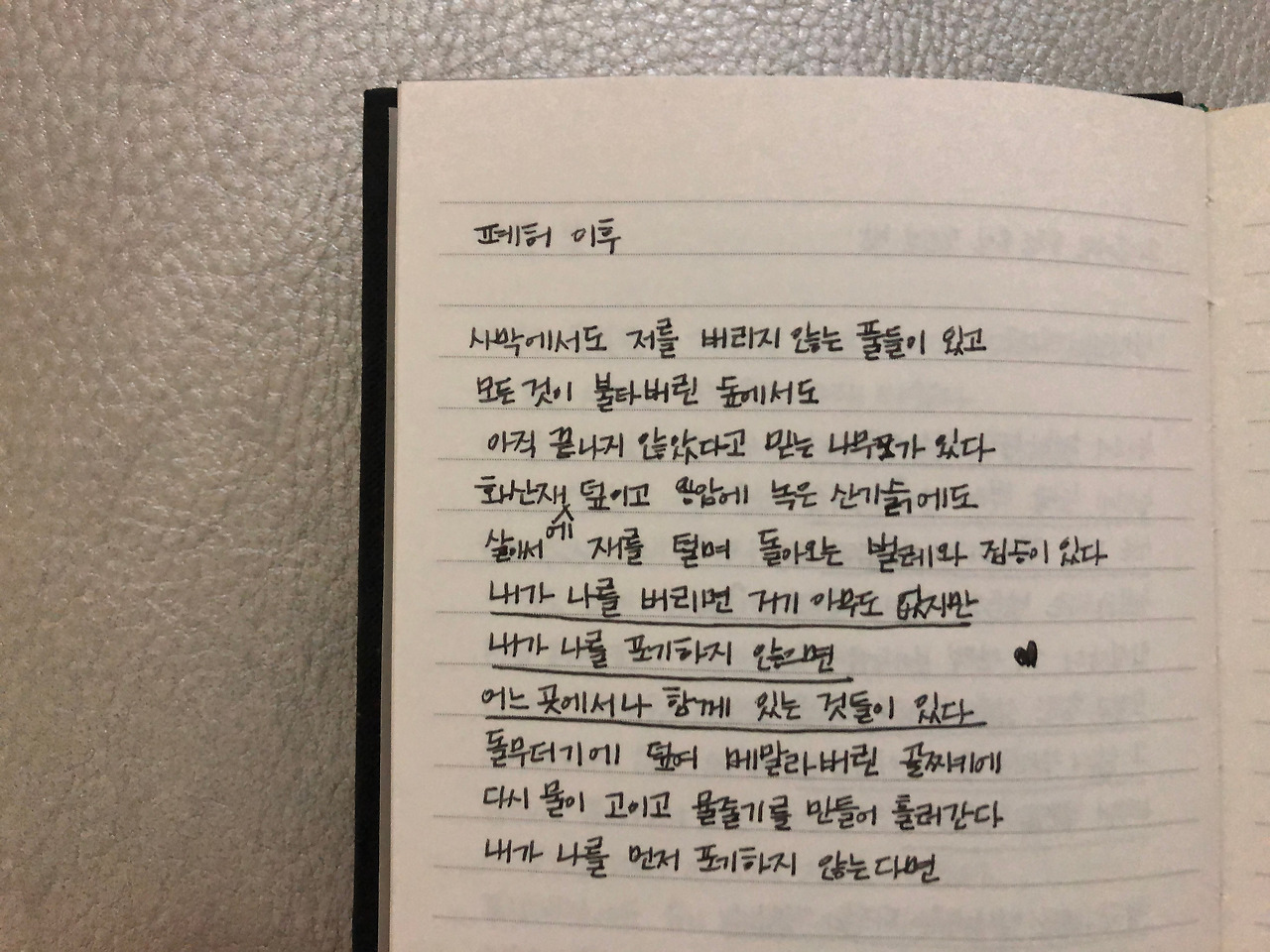 오늘 하루는 어떻게 보내셨나요? 그동안 무수히 써왔던 ‘안녕’이라는 단어를 썼다 지웠습니다. 안녕이라는 단어는 ‘아무 탈이 없는 편안함‘이라는 뜻을 지녔는데 상대가 안녕치 못한 걸 뻔히 알면서도 습관적으로 무의미하게 껍데기 같은 인사를 그대에게 건네고 싶지 않기 때문입니다.