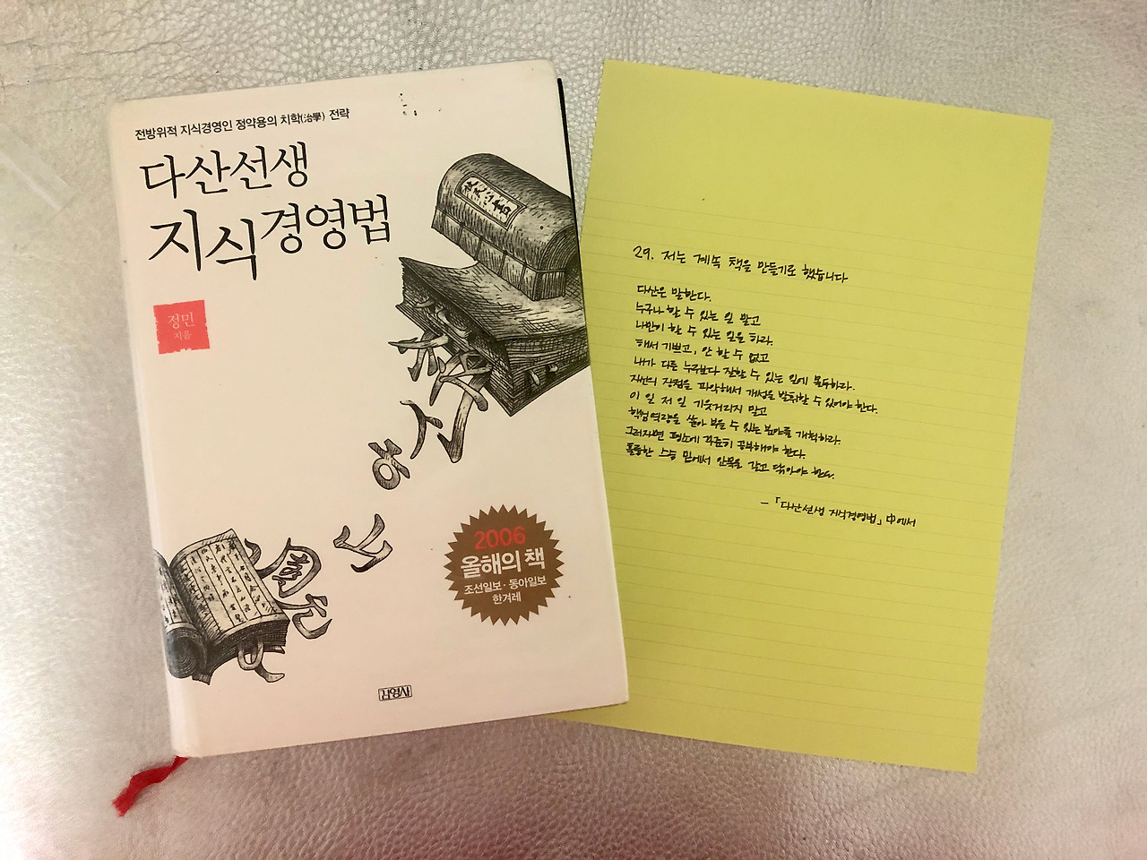 다산은 말한다. 누구나 할 수 있는 일 말고 나만이 할 수 있는 일을 하라. 해서 기쁘고, 안 할 수 없고, 내가 다른 누구보다 잘할 수 있는 일에 몰두하라. 자신의 장점을 파악해서 개성을 발휘할 수 있어야 한다. 이 일 저 일 기웃거리지 말고, 핵심역량을 쏟아 부을 수 있는 분야를 개척하라. 그러자면 평소에 꾸준히 공부해야 한다. 훌륭한 스승 밑에서 안목을 갈고 닦아야 한다. _ 「다산선생 지식경영법」중에서