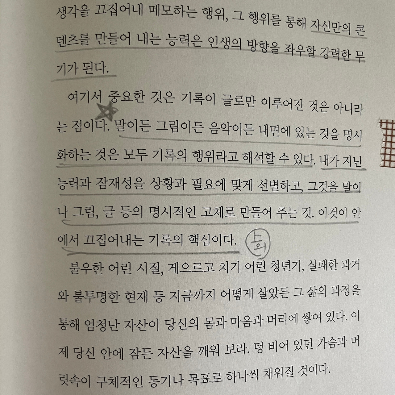 말이든 그림이든 음악이든 내면에 있는 것을 명시화하는 것은 모두 기록의 행위라고 해석할 수 있다. 내가 지닌 능력과 잠재성을 상황과 필요에 맞게 선별하고, 그것을 말이나 그림, 글 등의 명시적인 고체로 만들어 주는 것, 이것이 안에서 끄집어내는 기록의 핵심이다.