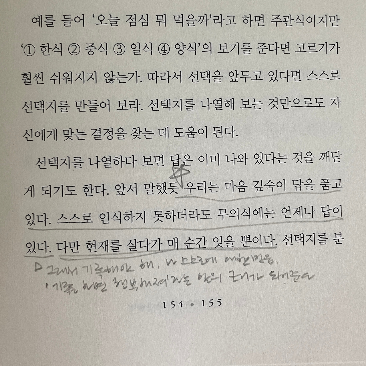 그러나 내 마음 저 밑에서는 여전히 못마땅함이 자리 잡고 있었고 그러한 마음은 나도 모르게 내 눈을 세모로 만들었다. 나 홀로 이 책을 읽었더라면 그 세모눈은 네모 눈까지 되긴 했어도 동그라미까진 어려웠을 텐데 모임의 공유도서로서 책을 읽다 보니 달랐다. 세상에 나쁜 경험은 없다는 말처럼 세상에 나쁜 책은 없다, 내가 활용하기 나름이라는 생각으로 마음이 확 기울어졌다. 그 결과 책을 읽는 동안 모임에서 함께 나누면 좋을 다양한 질문을 얻을 수 있었다. 또 혼자 읽었다면 절대 해보지 않았을 생각과 기록을 할 수 있었던 것도 사실이다.