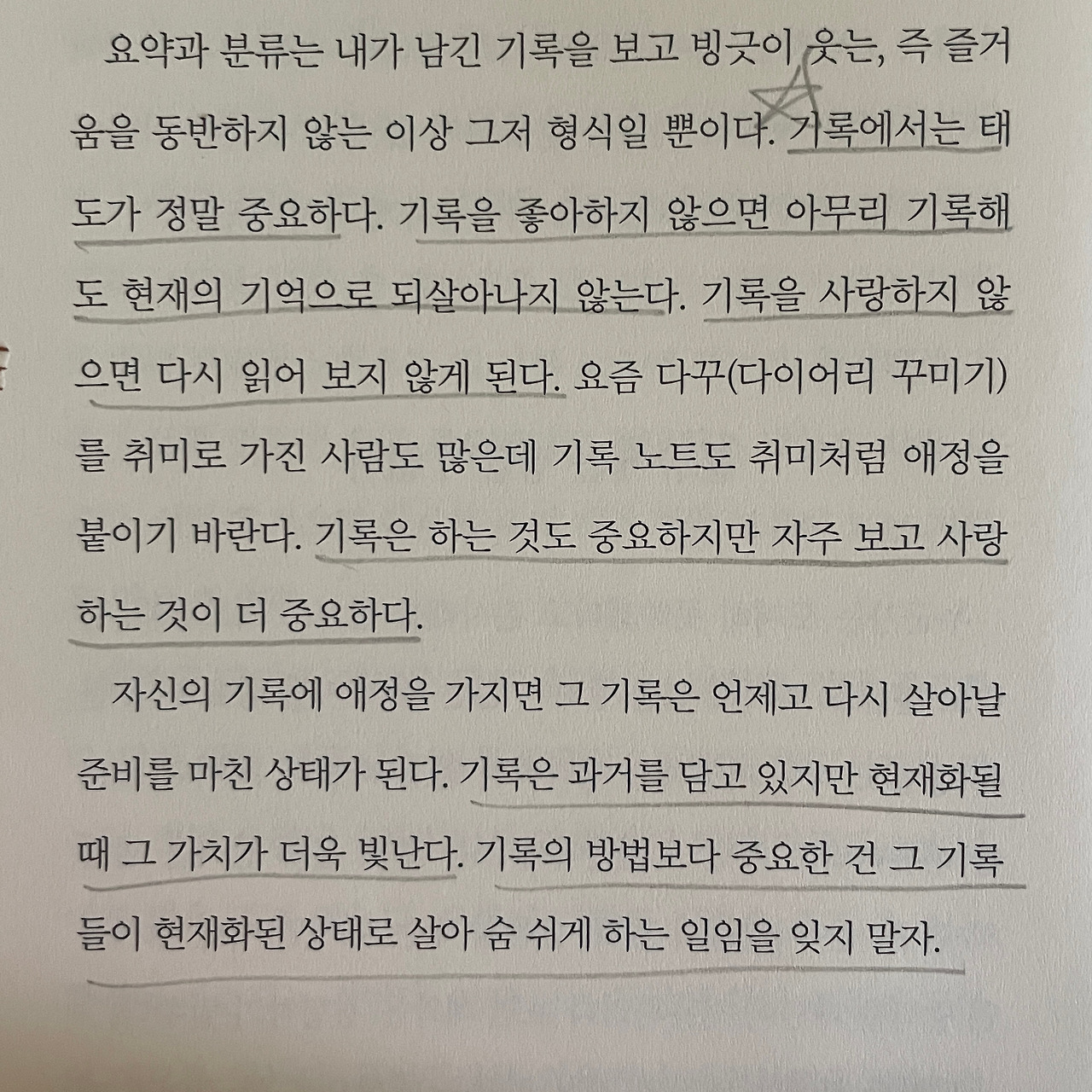 기록에서는 태도가 정말 중요하다. 기록을 좋아하지 않으면 아무리 기록해도 현재의 기억으로 되살아나지 않는다. 기록을 사랑하지 않으면 다시 읽어 보지 않게 된다. / 기록을 하는 것도 중요하지만 자주 보고 사랑하는 것은 더 중요하다. / 기록은 과거를 담고 있지만 현재화될 때 그 가치가 더욱 빛난다. 기록의 방법보다 중요한 건 그 기록들이 현재화된 상태로 살아 숨 쉬게 하는 일임을 잊지 말자.