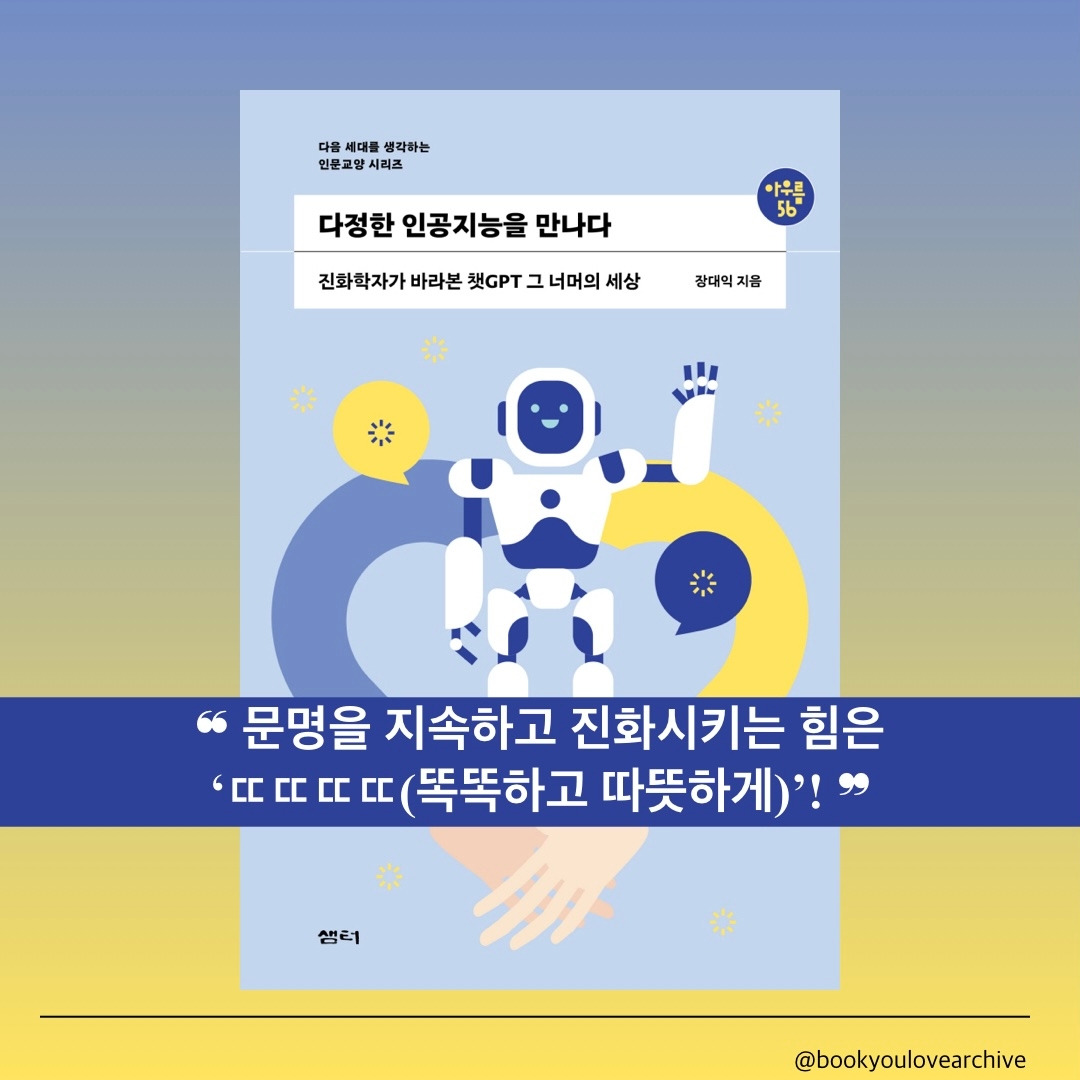(23/09/20) 최근 챗GPT를 실생활에서 다양하게 활용하면서 인공지능에 관심이 생겼는데 ‘다정한 인공지능’이라는 표현은 뭔가 새롭게 느껴져 이번 샘터 물방울서평단 세 번째 서평 도서로 인문교양시리즈 아우름 56 『다정한 인공지능을 만나다』를 선택했다. 아우름은 ‘각계 명사에게 ‘다음 세대에 꼭 전하고 싶은 한 가지’가 무엇인지 묻고 그 답을 담는 인문교양 시리즈’라고 하는데, 여는 글과 총 4장으로 이루어진 본문, 그리고 닫는 글까지, 알찬 강연을 하나 듣는 느낌으로 책을 읽었다.