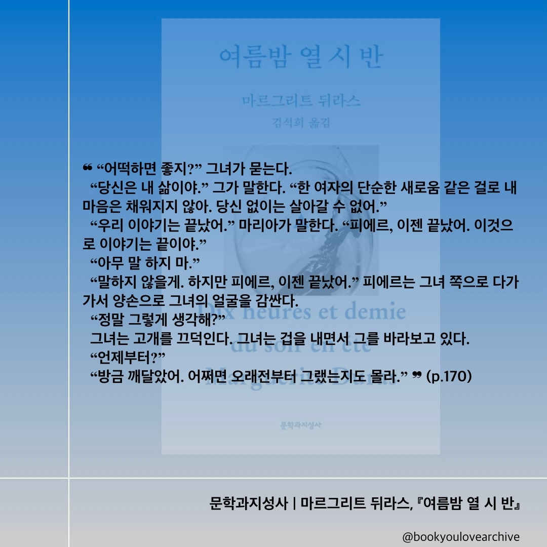 그녀가 몸에 뿌린 향수는 그녀 자신에 대한 그녀의 절대권, 그녀에 대한 사랑으로부터 떠나간 그의 배반, 그녀에 대한 그의 동정심, 이런 것들을 담고 있는, 다시없이 소중한 향수였다. 즉 그녀는 사랑의 종말을 예고하는 향기를 몸에 묻히고 있었던 것이다. (p.168-169)