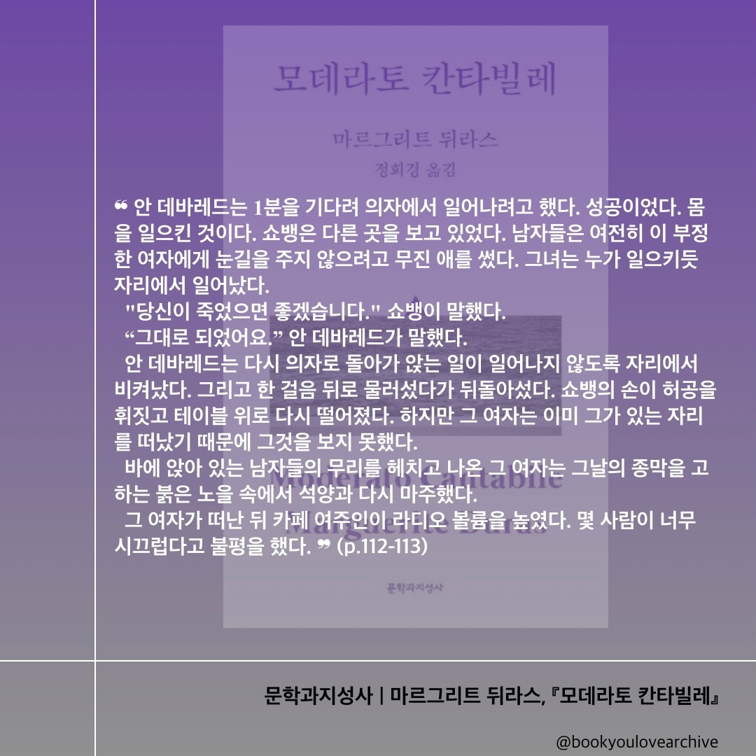 『여름밤 열 시 반』을 읽은 후 바로 이어 읽으면 좋을 것 같아서 『모데라토 칸타빌레』를 집어 들었다. 개인적으로는 이 작품이 조금 더 좋았다.