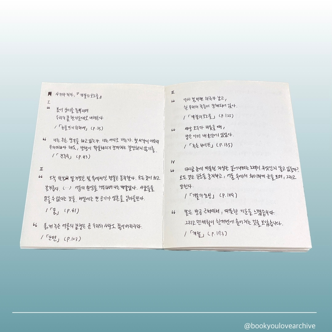 (23/10/16) 시집을 다 읽고 나서 ‘계절의 모노클’이라는 시집의 제목이 정말 잘 어울린다는 생각을 했다. 시들을 읽는 동안 사계절의 풍경을 두 눈으로 직접 보는 것보다, 한쪽 눈으로 렌즈를 통해 바라보는 듯한 느낌이 들었기 때문이다.