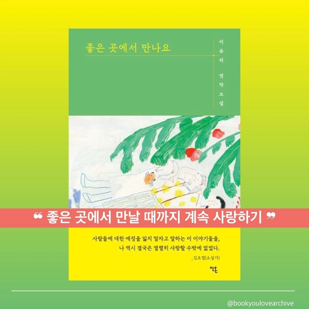 (23/10/25) 『모든 것들의 세계』가 ‘끝내 사랑을 멈추지 않는 마음’에 관해 이야기한다면, ‘사람은 죽어서 무엇이 되며 어디로 가는지’에 관한 작가의 궁금증으로 시작해 결국 사랑이 계속되는 것으로 이어지는 『좋은 곳에서 만나요』 속 이야기들이 정말 좋았다. 이 세계의 다채로움과 아름다움을 사랑하고, 그리고 그 세계를 이루는 사람들을 사랑하는 이유리의 이야기가 좋다.