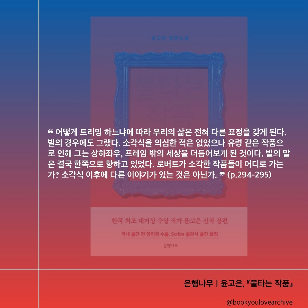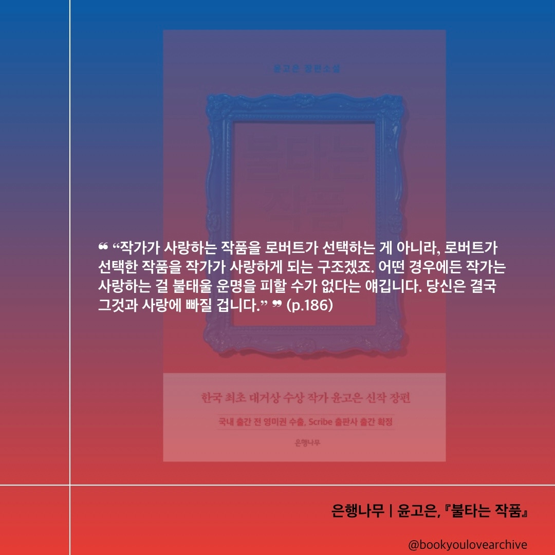 | “작가가 사랑하는 작품을 로버트가 선택하는 게 아니라, 로버트가 선택한 작품을 작가가 사랑하게 되는 구조겠죠. 어떤 경우에든 작가는 사랑하는 걸 불태울 운명을 피할 수가 없다는 얘깁니다. 당신은 결국 그것과 사랑에 빠질 겁니다.” (p.186)