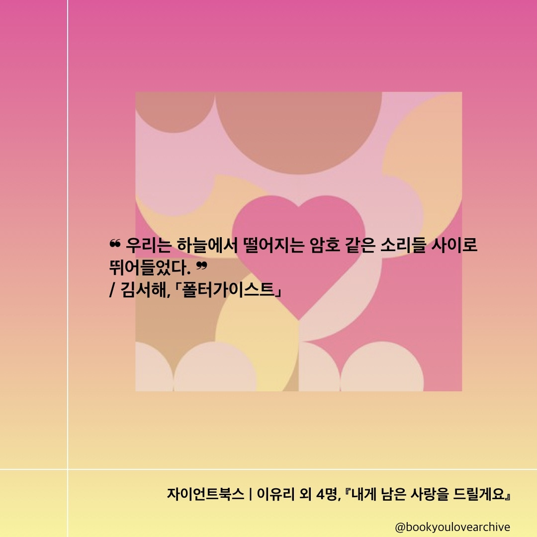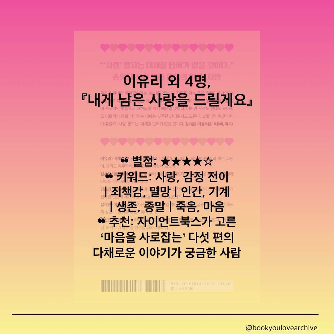 전자책으로 읽었는데 이 책은 꼭 소장해서 두고두고 읽고 싶어졌다. 이유리, 김초엽, 천선란 작가님의 작품들은 역시 좋았고, 이 책으로 처음 만나게 된 김서해, 설재인 작가님의 작품 또한 각자의 매력으로 통통 튀는 느낌이었다. 김겨울 작가의 발문에서 ‘다섯 작가의 작품이 각기 다른 매력을 가지고 있어 독자를 즐겁게 한다’(「남은 사랑을 볼 수 있다면」, p.281)라는 설명이 딱 들어맞는 앤솔러지였다.
