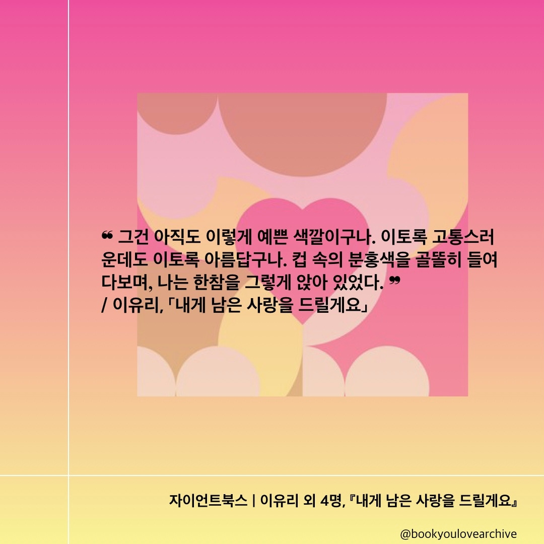 | 그건 아직도 이렇게 예쁜 색깔이구나. 이토록 고통스러운데도 이토록 아름답구나. 컵 속의 분홍색을 골똘히 들여다보며, 나는 한참을 그렇게 앉아 있었다.