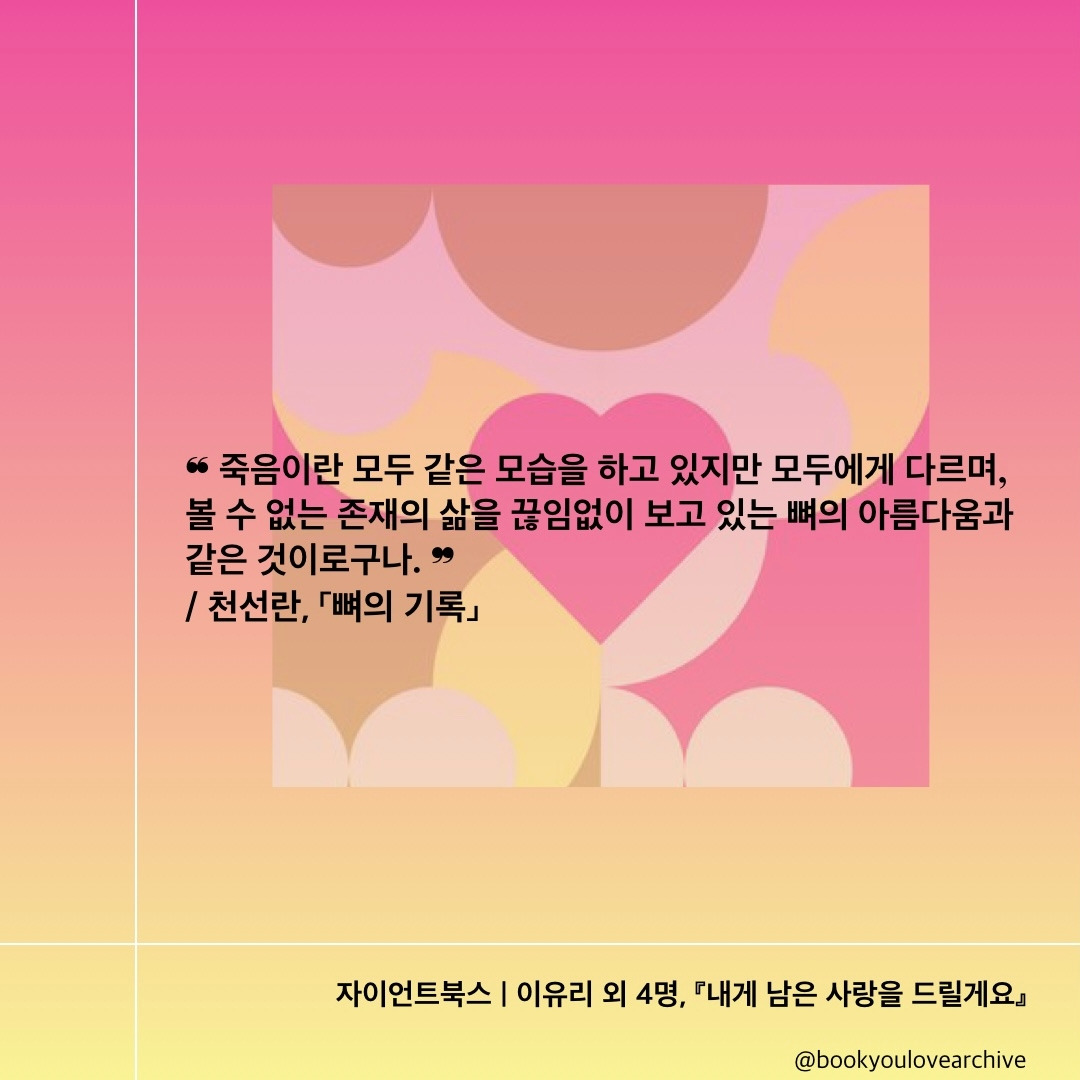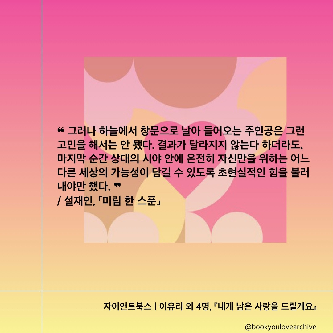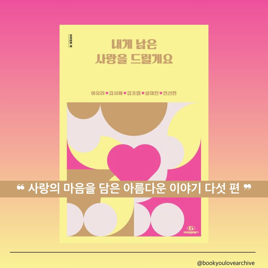 (23/11/20) 자이언트북스에서 출간된 앤솔러지 시리즈 ‘자이언트 픽’은 일 년에 한 번, 매해 첫 달 출간될 예정이라고 한다. 자이언트 픽의 첫 책, 『내게 남은 사랑을 드릴게요』는 이유리, 김서해, 김초엽, 설재인, 천선란 다섯 작가의 작품이 수록되어 있다. ‘마음을 사로잡는 이야기’들로 ‘자이언트북스가 Pick한 이야기들’이 어떤 것일지 궁금해졌다.