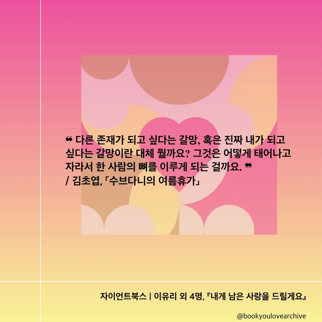 | 다른 존재가 되고 싶다는 갈망, 혹은 진짜 내가 되고 싶다는 갈망이란 대체 뭘까요? 그것은 어떻게 태어나고 자라서 한 사람의 뼈를 이루게 되는 걸까요.