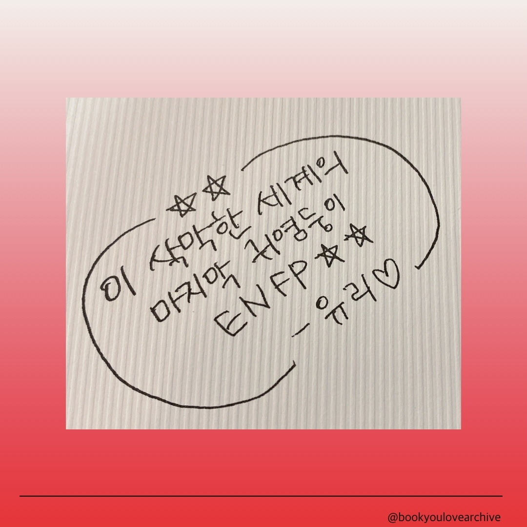 내가 F가 거의 80% 가까이 나오는 극 F고, 친한 친구들이 INFJ, INFP인 경우가 많아서 그런지 이유리, 이서수, 김화진 작가님이 쓰신 후반부의 세 작품들을 더 재미있게 읽었다. 특히나 이유리 작가님의 「그때는 그때 가서」가 이 책의 내 최애 작품! 이유리 작가님이 그린 ENFP 주인공 수진과 거의 한 몸이 된 것처럼 몰입해서 읽었다. 이유리 작가님의 Q&A를 읽으니 정말 작가님과 나는 같은 엔프피구나 느껴져서 신기했다 ㅋㅋ 작가님은 ‘머릿속이 꽃밭’(p.111)이라고 점잖게 표현하셨지만, 종종 친구들에게 ENFP 유형이 ‘대가리 꽃밭’이라는 말이 있다더라고 말하며 깔깔 웃곤 했던 나라서 첫 문장을 읽는 순간 이 소설을 사랑할 수밖에 없게 될 거라는 예감이 들었다. 다 읽은 후에는 정말 대책 없으나 사랑스러운 수진을 사랑할 수밖에 없었고.