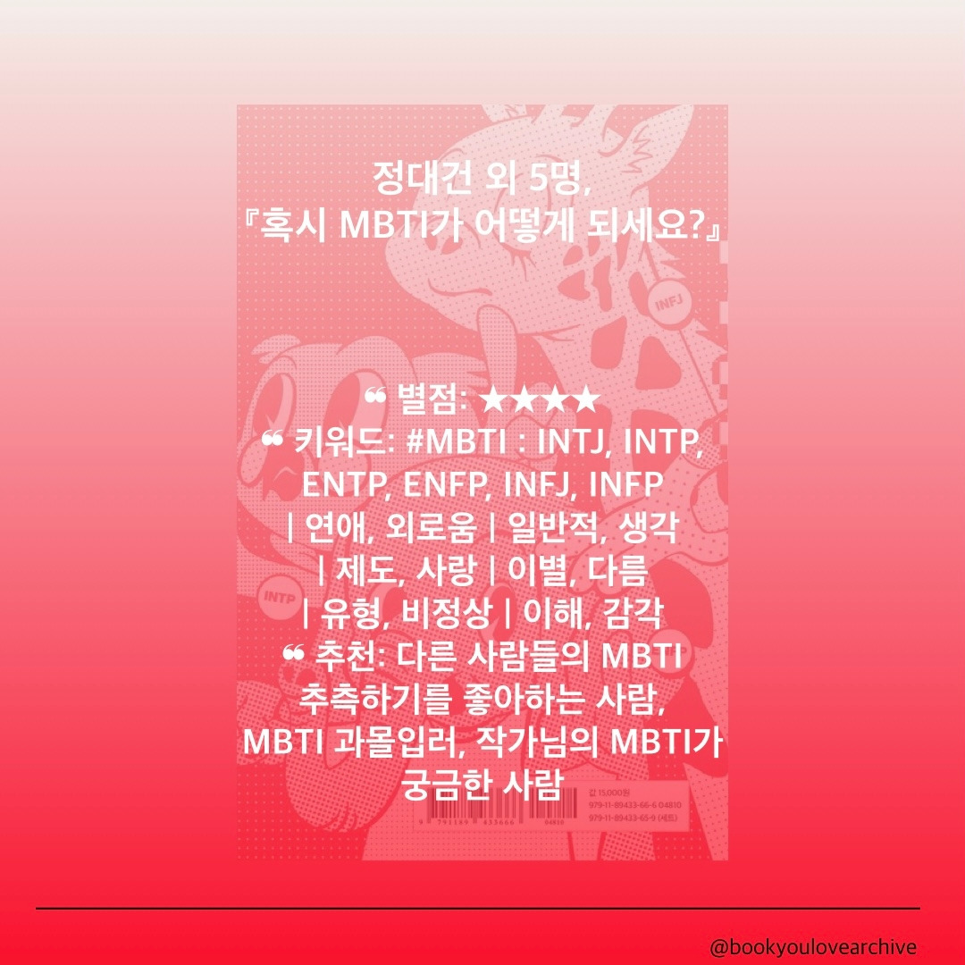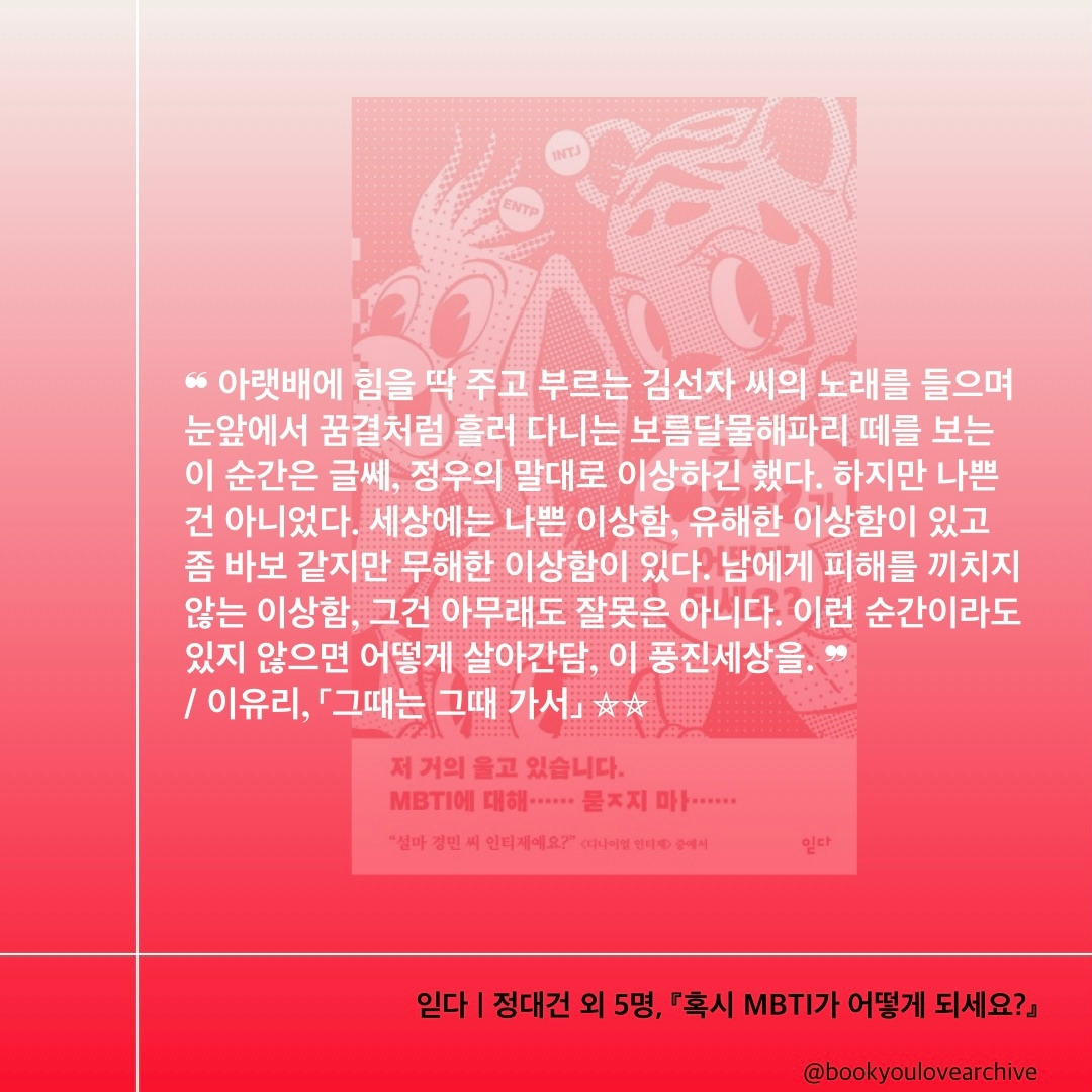 (23/11/21) 우주 최초 MBTI 테마 소설집이라니! 읻다 넘나리 세 번째 도서를 고를 때 망설임 없이 『혹시 MBTI가 어떻게 되세요?』를 택한 이유는 좋아하는 이유리 작가님이 ENFP로 소설을 쓰셨기 때문! 나도 ENFP라 운명처럼 느껴져 더욱 신이 났다. ㅋㅋㅋㅋ