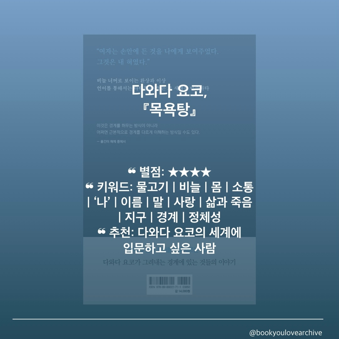 (23/11/23) 읻다 넘나리 서포터즈 두 번째 도서 서평 제출 후 우수 참여자 중 한 명으로 뽑혀 편집자 김소띠 님의 최애책을 한 권 선물 받았다. 바로 다와다 요코의 『목욕탕』! 은행나무 에세 시리즈에서 『지구에 아로새겨진』과 『별에 어른거리는』으로 이름을 알게 된 작가인데 아직 작품을 읽어보진 않았었다. 다와다 요코의 소설 중 편집자님이 제일 좋아하는 작품이라고 하셔서 너무 부담스럽지 않은 두께길래 궁금한 마음에 세 번째 서평을 제출하고 바로 이 책을 꺼내 들었다.