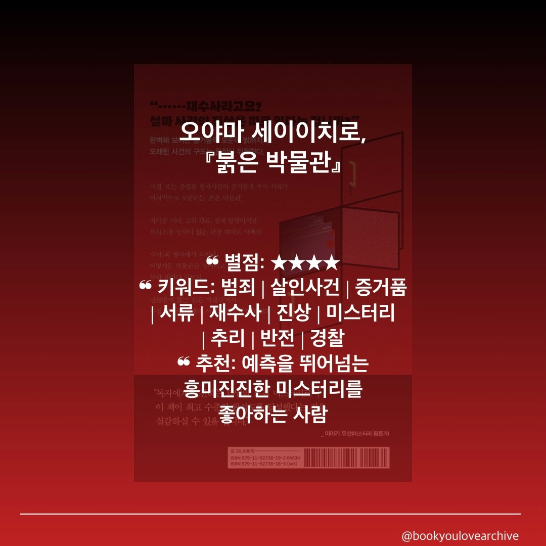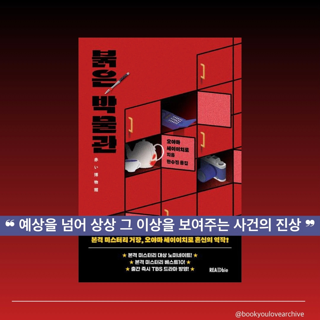 (23/11/25) 청년서가와 리드비가 함께 한 기대평 이벤트에 당첨되어 감사하게도 『붉은 박물관』 도서를 제공받았다. 카드 뉴스가 매우 흥미로워서 눈길이 갔던 책이었는데, 정말 오랜만에 읽게 된 일본 미스터리라서 더욱 기대가 되었다. 몇몇 미스터리들은 중간쯤 읽다 보면 대충 범인을 때려 맞추곤 했는데 이번에는 읽으면서 나의 예상이 한 번 빼고 모두 빗나가서 더욱 재미있게 읽었다. ‘예상을 넘어 상상 그 이상을 보여주는 사건의 진상’이란 한 줄 평을 쓴 것도 정말 사건의 진상들이 상상 그 이상으로 충격적이기 때문이다.