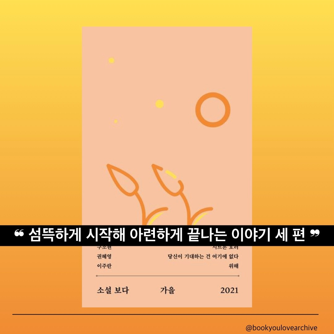 (23/11/29) 문학과지성사의 소설 보다 시리즈를 모아보자 생각하고 소설 보다 2023 외에 처음 구입한 『소설 보다: 가을(2021)』. 작가보다는 작품의 제목들에 끌려 사게 된 책인데 나의 기대를 충분히 충족할 수 있는, 만족스러운 독서를 했다. ‘닿음과 닿지 않음’의 소설들이라는 출판사의 소개처럼 물리적, 심리적, 그리고 시공간의 닿음과 닿지 않음에 관한 이야기로 읽을 수 있었다. 세 편 다 정말 좋았지만 가장 내 취향은 구소현 작가님의 「시트론 호러」! 시트론이라는 상큼한 느낌의 과일과 호러라는 단어가 어울리지 않는 조합이라고 생각했는데 다 읽고 나서 제목이 잘 어울린다는 생각을 했다.