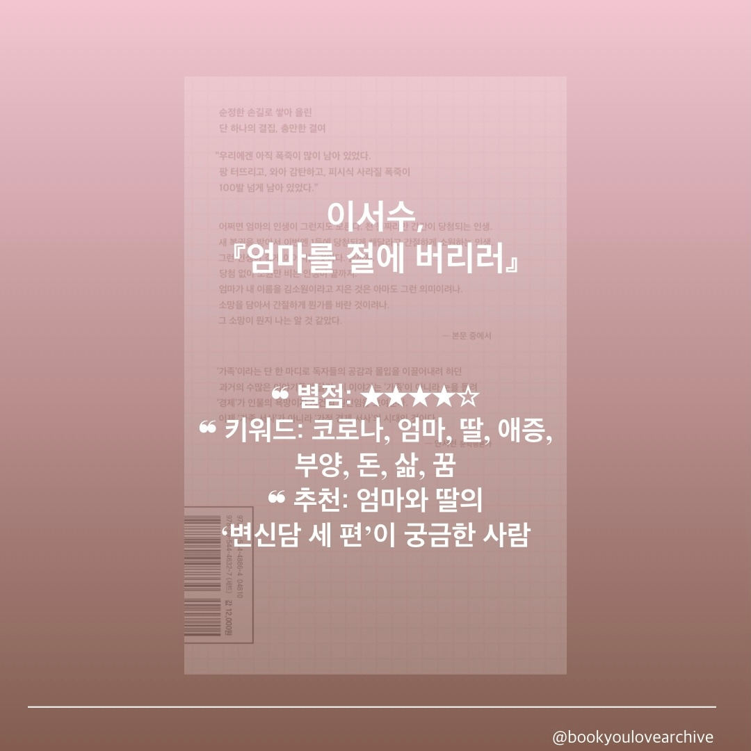 엄마라는 단어를 생각하면 뭉클해지고 울컥해질 때가 있다. 엄마가 조금 더 나이가 든 후에 이 소설을 다시 읽어보면 좀 더 깊이 공감할 수 있을 것 같단 생각이 든다. 세상 모든 ‘엄마’들을 응원하고 싶은 마음!
