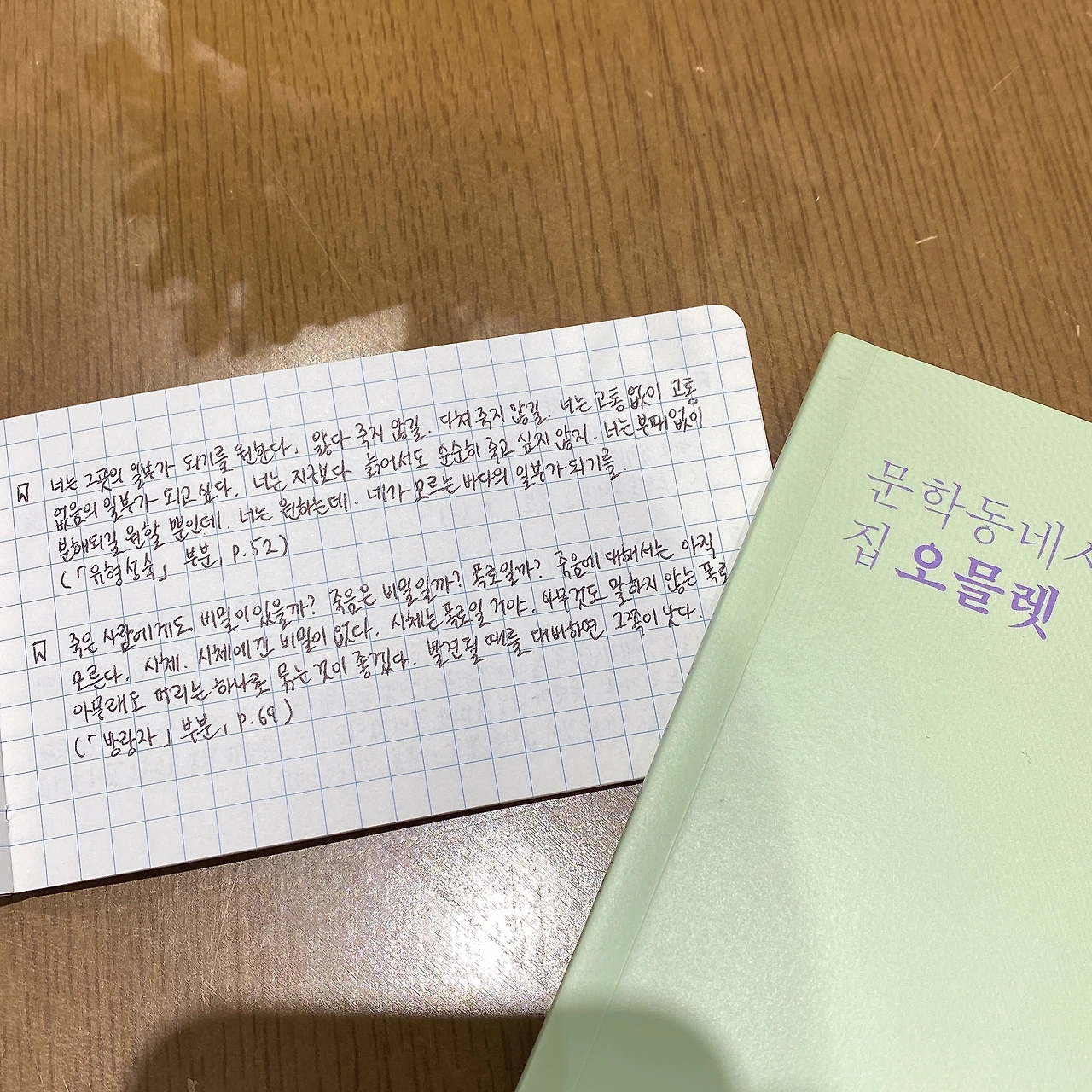 제목처럼 몽글몽글 부드럽고 따뜻한 오믈렛 같은 시들이 가득할 줄 알았는데, 예상 밖의 시집이었다. 죽은 사람, 죽고 싶은 사람, 죽지 못하고 다시 깨어나 살아가는 사람 등 죽음 이야기가 꽤나 많은 비중을 차지하고 있다. 시체로 발견될 때를 대비해 머리를 하나로 묶는 것이 좋겠다고 말하는 마음. (「방랑자」 (p.69) 부분) 죽음을 들키고 싶지 않으면서도 누군가는 나의 죽음을 알아차릴 것이란 것을 알고 있는 마음과 죽은 자의 얼굴을 발견하게 될 이가 누구일지를 궁금해하는 마음. 그러면서도 그 끔찍한 광경을 만나는 이가 아이는 아니었으면 하고 바라는 마음. (「포노토그래프」 (p.74) 부분) 해가 뜨지 않는 아침을 찾으러 왔지만 호숫가를 따라 걸으며 깨끗하고 예쁜 조약돌을 찾아 주머니에 넣는 마음. (「빗금」 (p.73) 부분)