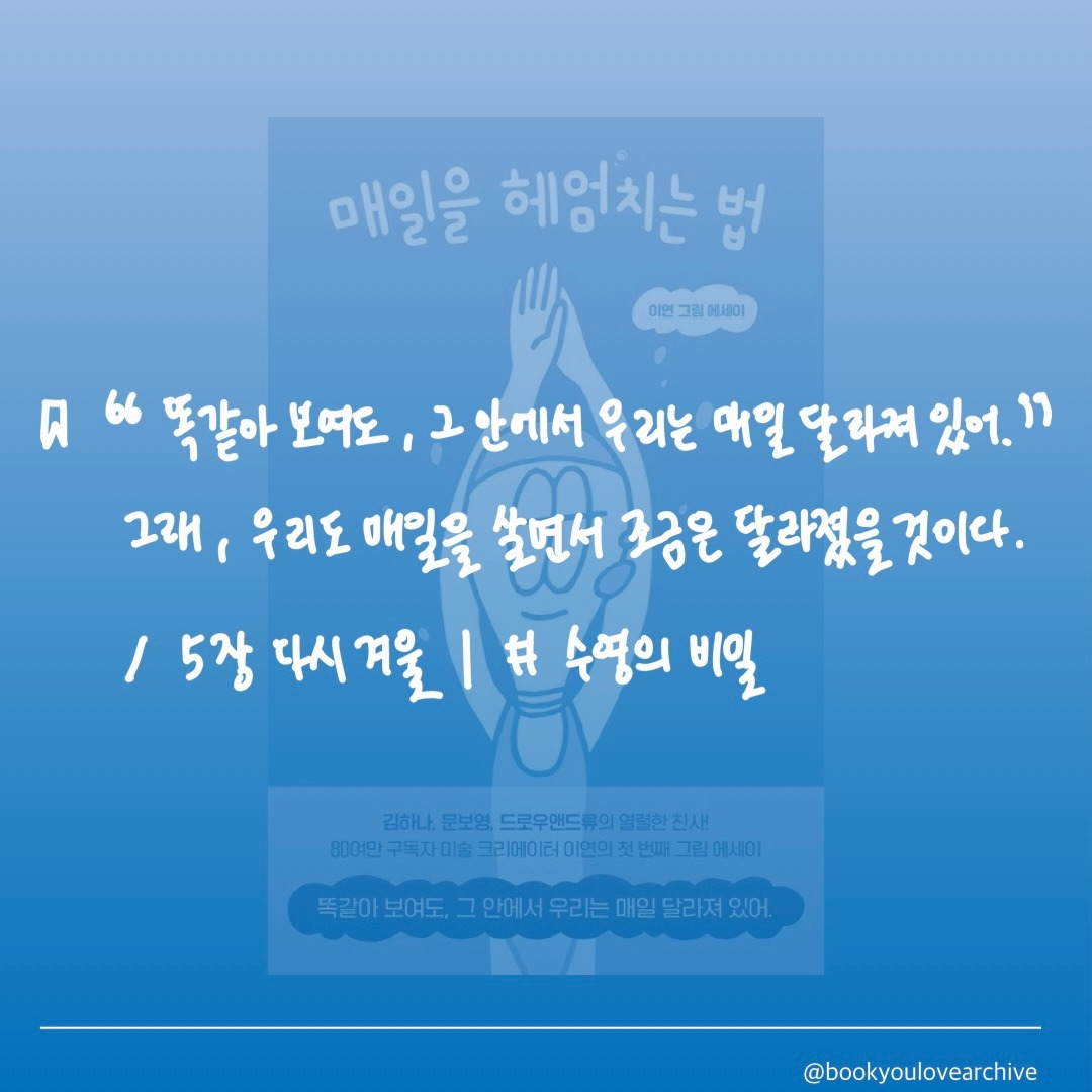* 내가 나일 수 있도록, 하나하나 꾸준히 해내다 보면 어느새 내가 있던 자리에서 꽤나 멀리 온 나 자신을 발견할 수 있을 것이란 믿음. 더뎌 보여도, 제자리에 머물러 있는 것 같아도, 매일을 헤엄치다 보면 ”그 안에서 우리는 매일 달라져 있을 것”이라는 응원. ‘껍데기를 벗어던진 가장 약해진 그 순간에 비로소 성장하는’ 우리. 어쩐지 나도 멀리 헤엄쳐갈 용기가 생기는 것 같다. [23/12/27]