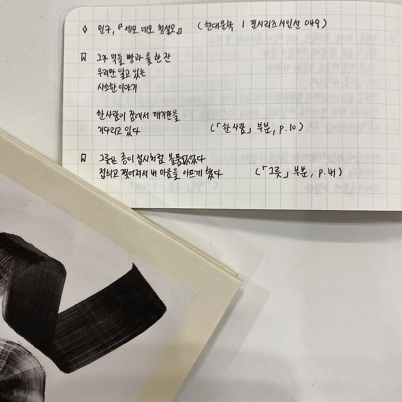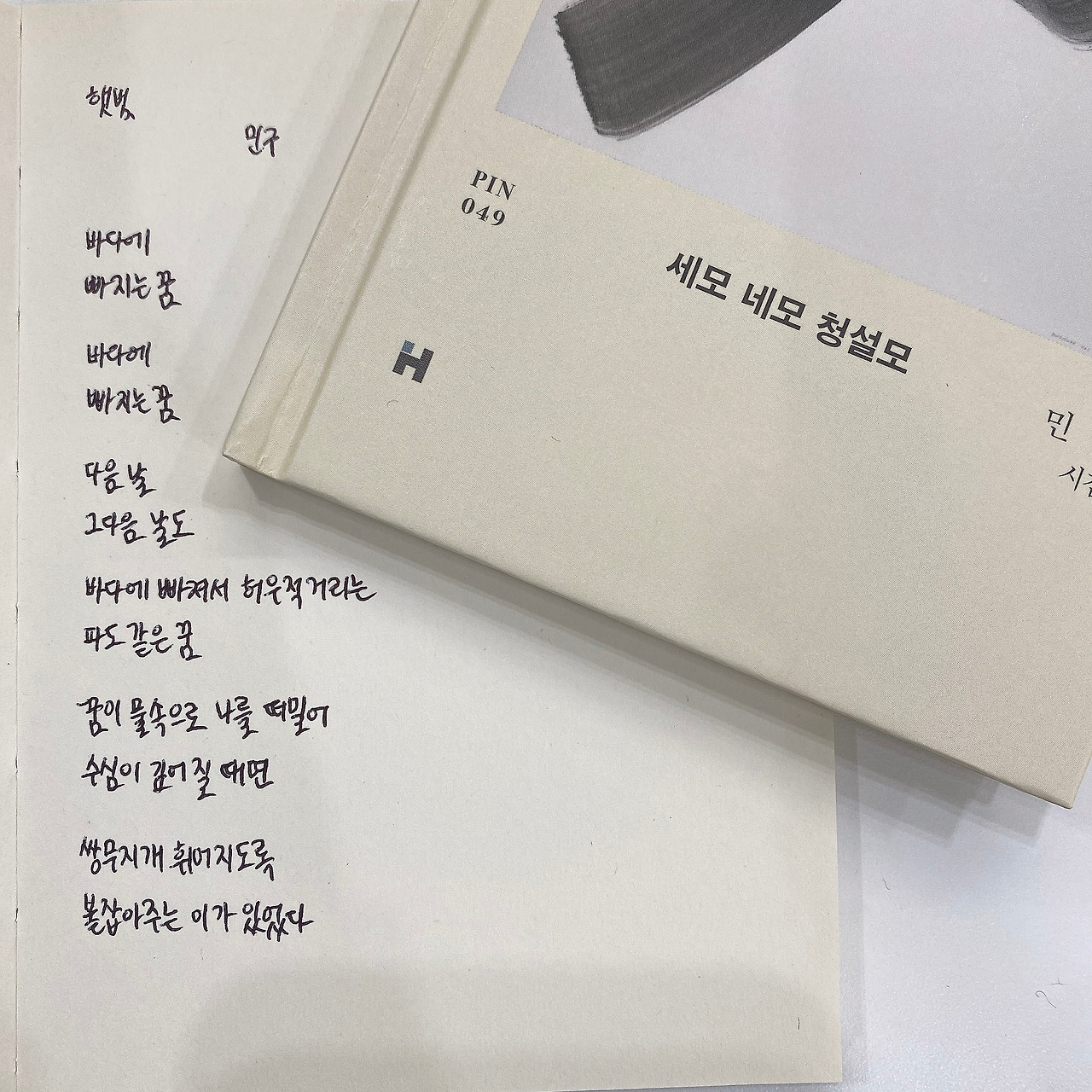 * 얼마 전 서점 위트 앤 시니컬에서 열린 민구 시인의 낭독회를 유튜브 스트리밍으로 봤는데, 시가 유쾌하고 웃긴 것만큼 민구 시인도 참 유쾌하고 웃긴 분 같았다. 이번 시집의 제목 『세모 네모 청설모』와 시집 표지에 관한 이야기를 해주셨는데 엄청 솔직 담백하게 말씀하시는 게 묘하게 재미있고 유쾌해서 즐겁게 들었다.