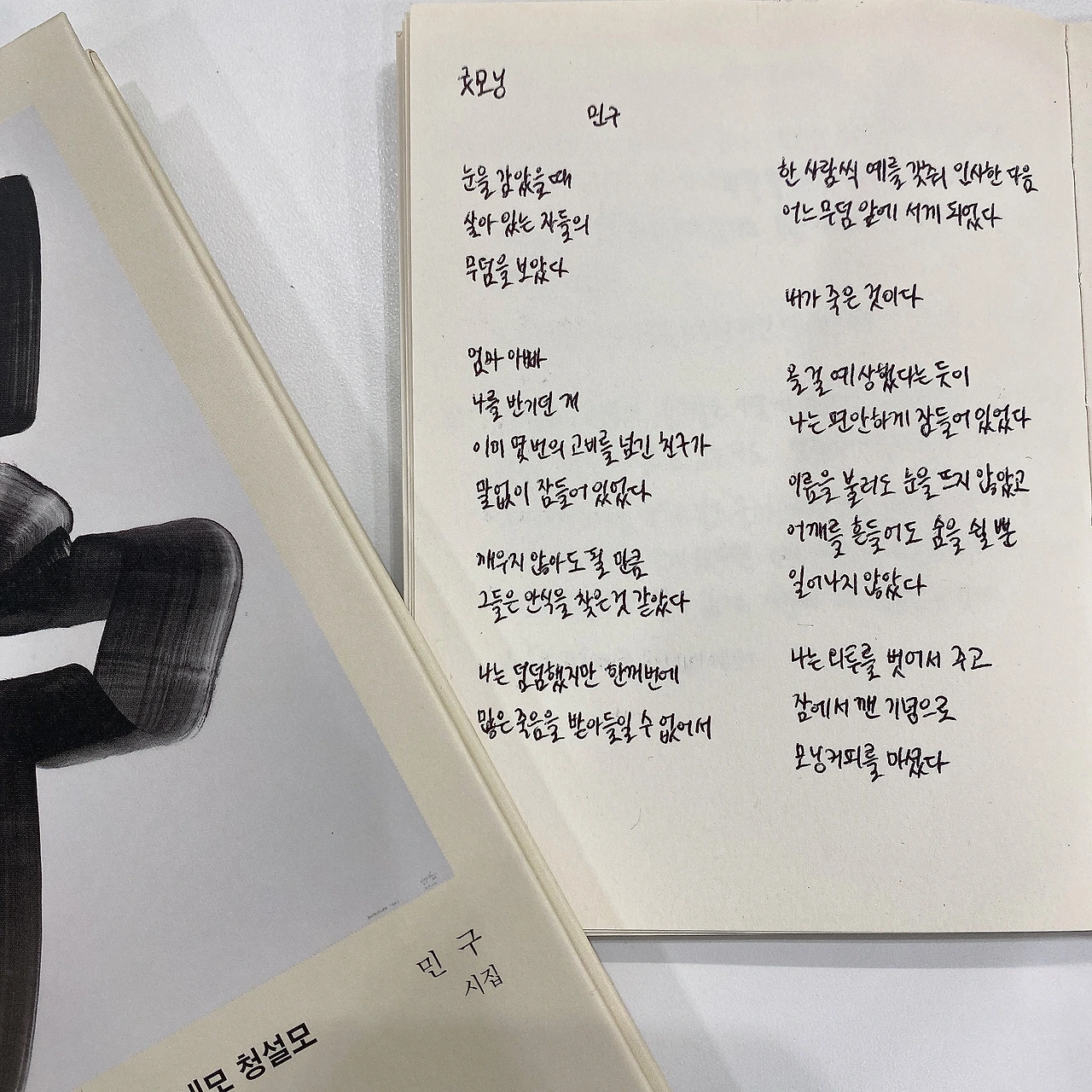 * ‘사랑한다면 벼멸구라도 상관없다’고 하며 누구와도 ‘친구가 될 준비가 됐다’는 민구 시인. ‘별명 없이 이제 이름으로 불리는 게 마냥 좋지만은 않다’(p.110)는 시인에게 족제빗과 동물 밍크와 민구를 합친 ‘밍구’라는 귀여운 별명을 지어주고 싶어졌다. ‘좋아하는 일에 치중하면서 살고 싶다’는 그가 멋지고 귀엽다고 말하면 실례일까? 그러나 그건 정말 진심으로 멋지고 귀여운 일이라 생각한다. ‘밍구’의 다음 시집도 벌써 기대된다. [23/12/29]