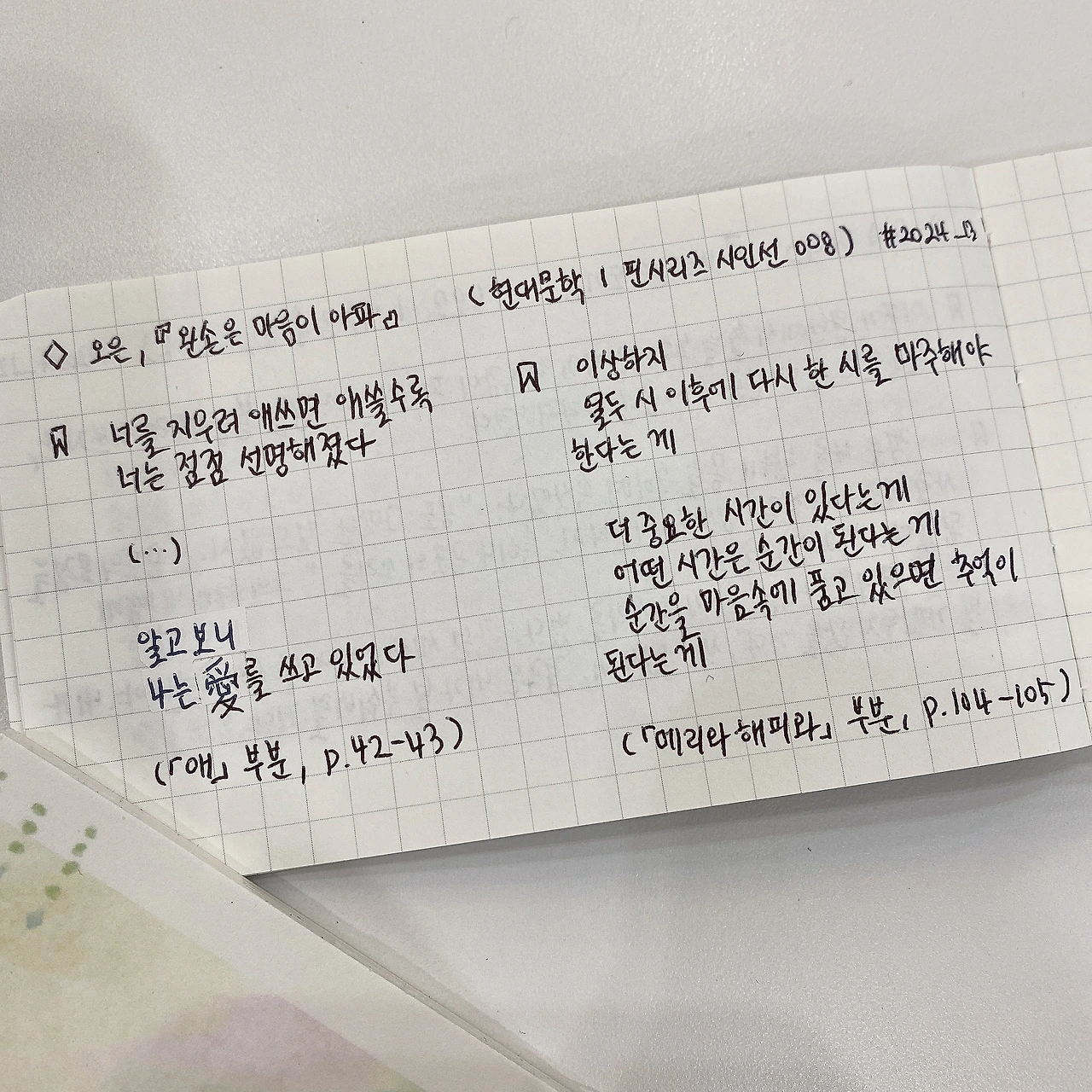 * 시집을 다 읽고 나서 왜 시집 제목을 ‘왼손은 마음이 아파’라는 구절로 정한 건지 궁금했다. 핀 시리즈 volume II의 에세이 주제가 ‘신체’고, 시인이 손과 손가락에 관한 에세이를 써서 「패러다임」이라는 시의 이 구절이 가장 잘 어울려서일까? 종종 시집 제목에 관해 생각해 보는데, 은근히 재미있다. 이 시집은 다른 제목이었으면 어땠을까? 읽으면서 시간과 순간에 관한 구절들이 인상적이어서 이와 관련된 제목이어도 좋지 않았을까 생각했다.