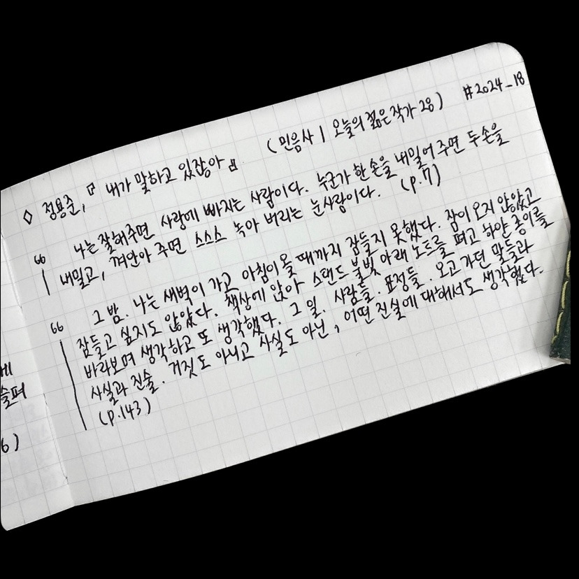 * 민음사의 오늘의 젊은 작가 시리즈에 궁금했던 작가님들이 참 많았는데 좋아하는 정용준 작가님으로 시리즈를 시작하니 다른 작품들도 완전 기대된다. 윤고은, 최진영, 박서련, 문지혁, 조예은 작가님 작품부터 천천히 읽어 봐야지! [24/01/30]