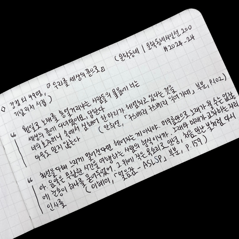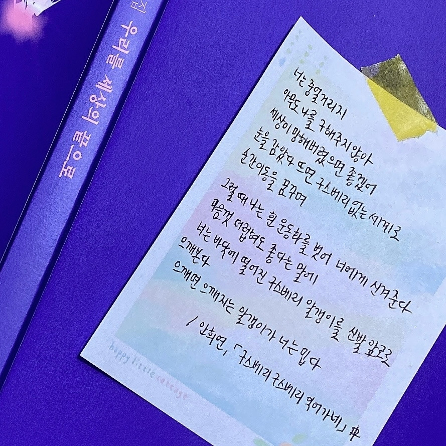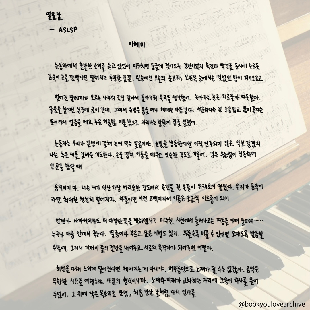 * 제일 좋았던 시는 안희연 시인의 「구스베리 구스베리 익어가네」, 이승희 시인의 「물속을 걸으면 물속을 걷는 사람이 생겨난다」, 그리고 이혜미 시인의 「얼음잠—ASLSP」! 이 세 편은 전문을 필사할 만큼 정말 좋았다. 사실 마음에 드는 구절들을 많이 발견해 필사도 엄청 많이 했다.