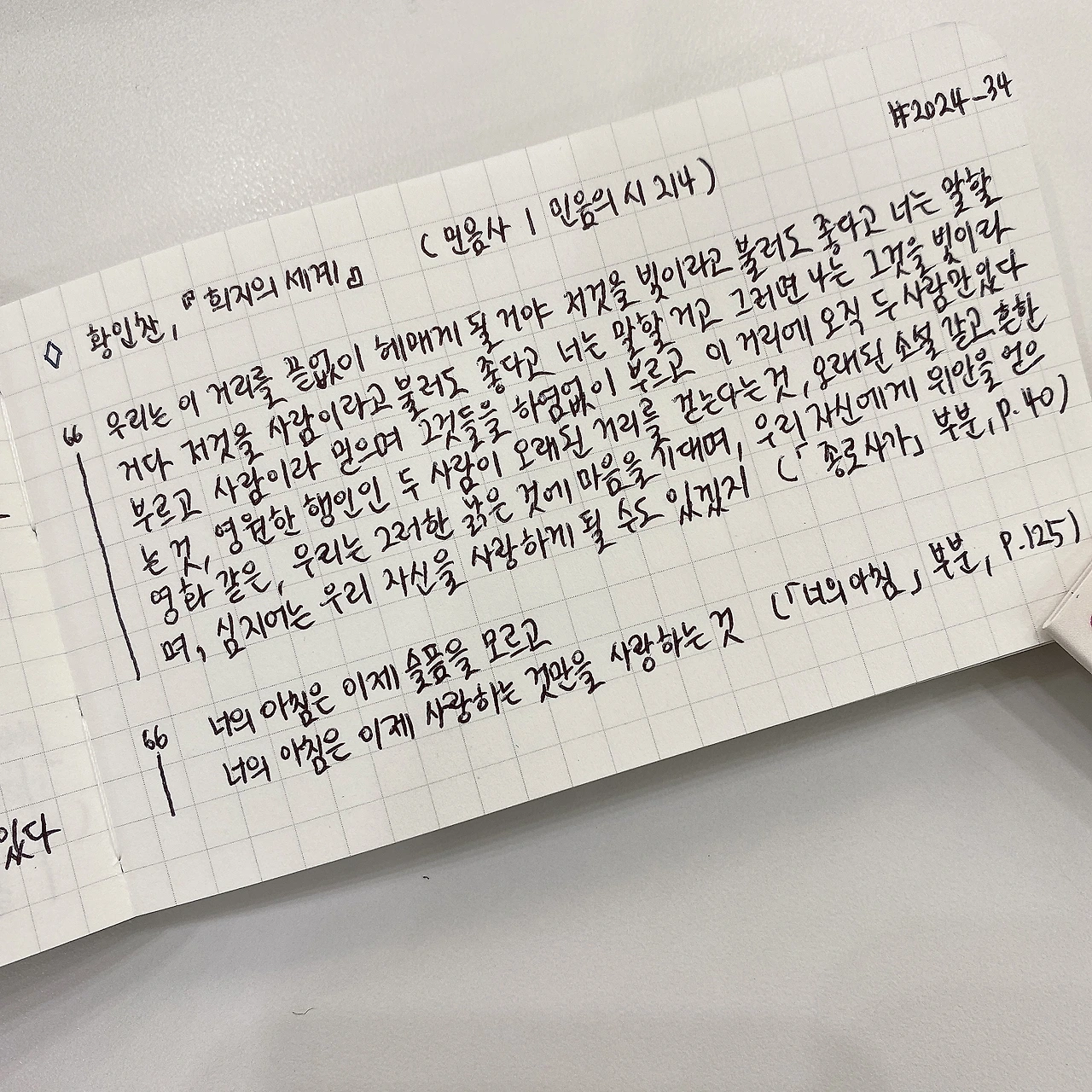 * ‘민음의 시’ 시리즈의 시집은 처음 읽어보는데요. 민음북클럽 잡동산이를 읽으면서 민음사에서도 국내 시인들의 시집을 내고 있었다는 걸 알게 되었고, 지난 패밀리데이 때 궁금했던 시인들의 시집을 구매했었어요. 황인찬 시인의 두 번째 시집 『희지의 세계』는 그때 구매했던 시집 중 한 권입니다.