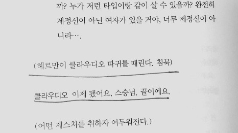 클라우디오의 깊은 눈망울을 표현한 남자 주인공 배우의 연기, 사람의 목소리 허밍으로 음향을 구성한 무대, 이야기와 공간을 넘나드는 무대 배치가 인상적이었다. 남들이 볼 수 없는 것을 보는 눈을 가진 자의 슬픔이 자꾸 머릿속에서 맴돌았다. 그러면서 우리는 언제까지나 표면으로 대상의 속성을 전체라고 결론짓는 우매함을 지을 것인가.