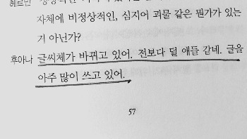 그렇지만 천성적으로 사람의 아우라를 꿰뚫어 보는 사람들의 눈은 매서운 법이리라. 어느 순간부터 후아나는 클라우디오의 작품이 변하고 있다는 것을 느낀다. 덜 애들 같아지고 그가 아주 글을 많이 쓴다고 느꼈다.