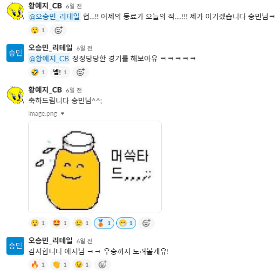 그리고 마지막 판에서 결국 13조가 이기며 우승하게 되었죠! 우승팀에겐 회식비가 별도로 지급됐습니다.