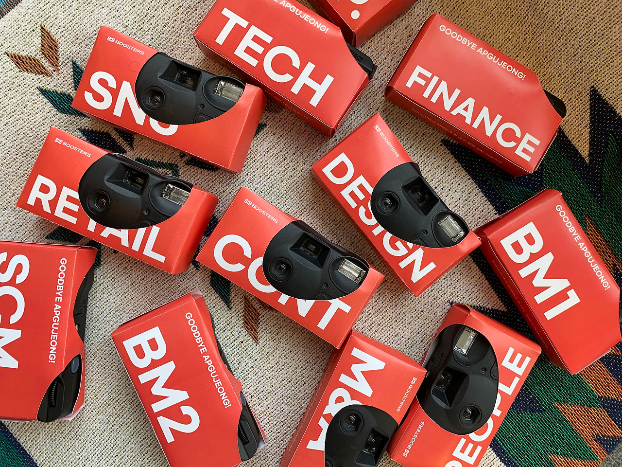 결국 남는 건 사진뿐이라고 하죠. 아날로그 감성의 필름 카메라를 팀 별로 배포했어요. 압구정에서의 마지막 일주일을 남겨두고 추억을 마음껏 담을 수 있길 바랐죠. 특별한 순간을 담아야 하는 특별한 카메라이기에 부스터스의 시그니처 컬러로 재디자인해 패키지를 입혔습니다. 인화한 사진은 압구정에서의 시간이 문득문득 생각날 때 즈음 공개할 예정이에요.