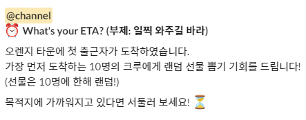그리고 대망의 이사 후 출근 첫날! 아직 새로운 루트와 사무실이 익숙하지 않을 구성원들을 위한 소소한 출근 이벤트를 준비했습니다. 일찍 도착하는 10명에게 랜덤 뽑기 기회를 드리는 '와츠 유얼 ETA(Expected Time of Arrival: 예상 도착 시간)?' 이벤트입니다. 사실 무한도전의 '일찍 와주길 바라' 편을 생각하고 준비했지만 다양한 연령대를 고려해 뉴진스의 ETA 로 이벤트명을 지었어요. 그렇게 가장 일찍 도착한 10명의 크루는 각기 다른 금액의 백화점 상품권을 받아 가셨습니다. 큰 금액은 아니더라도 일찍 출근한 보람을 느끼셨기를 바라요.