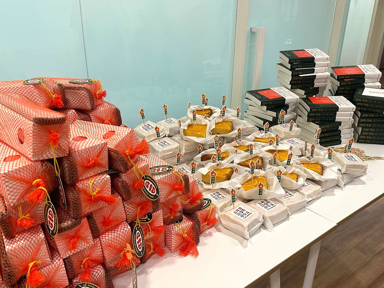 마지막으로는 이사 기념 선물을 나눠 드렸어요. 부스터스는 기회가 될 때마다 다양한 회사 굿즈를 나눠 드리고 있는데, 이번 이사 기념으로는 부스터스 로고가 새겨진 수저 세트와 양우산을 드렸어요. 또 윤호 대표님이 직접 고르신 책과, 편지, 그리고 유명한 베이커리의 오렌지 바닐라 케이크를 준비했어요. 재미를 위해 수저 세트 케이스에 '다 먹고살자고 하는 일이다'를 'This is all eat'로 번역했는데 제작 업체에서 오타인 줄 알고 연락이 오기도 했어요. 이번 이사가 회사뿐 아니라 구성원들에게도 특별한 의미를 가진 경험이 되었기를 바랍니다.