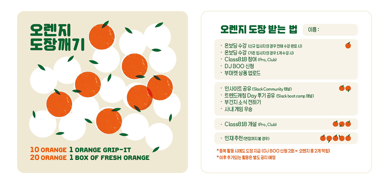 다만 참여 난이도에 따라 받을 수 있는 오렌지 도장의 개수가 다른데요. 단순 참여나 신청을 통한 프로그램은 오렌지 도장 한 개를 획득할 수 있고, 업무와 관련된 각종 인사이트를 공유하거나 사내 뉴스레터인 부간지에 소식을 전하는 미션에는 도장 두 개가 지급됩니다. 그리고 약간의 용기(?)가 필요한 Class818 개설은 오렌지 네 개, 회사 사랑의 끝판왕 인재 추천은 오렌지 다섯 개!