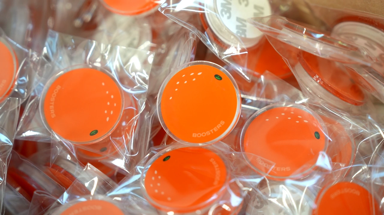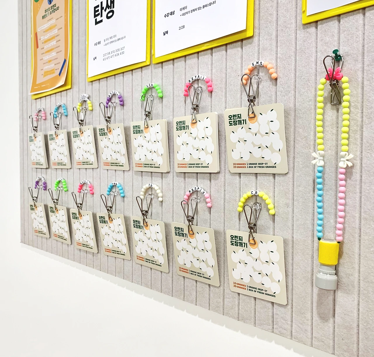 하지만 이 모든 프로그램은 구성원들을 위해 만들어진 것이기에, 어떻게든 그들의 참여를 이끌어내야 하는 게 저희의 역할! 하루에도 몇 개씩 지나치는 지루한 공지가 아닌 구성원 스스로 흥미를 가지고 자발적으로 참여할 수 있는 방법을 모색해야 했습니다. 그러던 중 뇌리를 스쳐간 완벽한 레퍼런스는 바로 중국집의 '포도송이 스티커'(한국인이라면 흥미롭지 않을 수 없다!!!) 하지만 여기는 부스터스이니 당연히 오렌지여야겠죠?