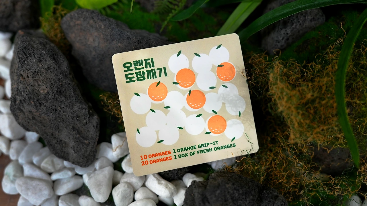도장 깨기를 위한 도장도 평범할 순 없겠죠? 오렌지 모양으로 특별 제작한 도장을 찍으면 초록잎이 있던 자리에 흰색 점이 콕콕 박힌 오렌지가 완성돼요.