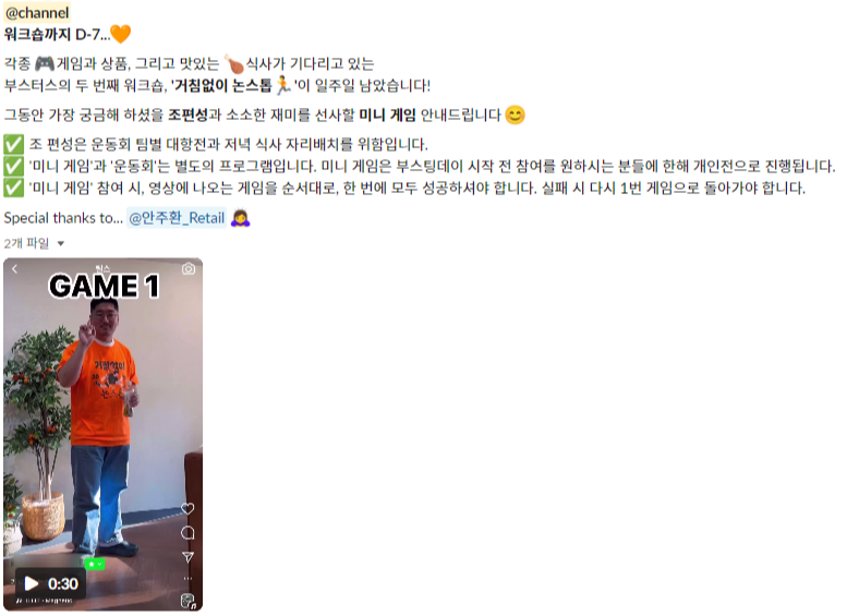 식사가 끝난 후에는 워크숍의 흥을 돋우기 위해 간단한 미니 게임을 준비했습니다. 미니 게임 참여 방법은 워크숍 일주일 전 슬랙을 통해 미리 안내드렸어요. (미리 연습하고 싶은 분들이 계실지도 모르잖아요..?) 게임 방법은 부스터스의 마스코트(?)인 리테일팀의 주환님이 찍어주셨습니다.