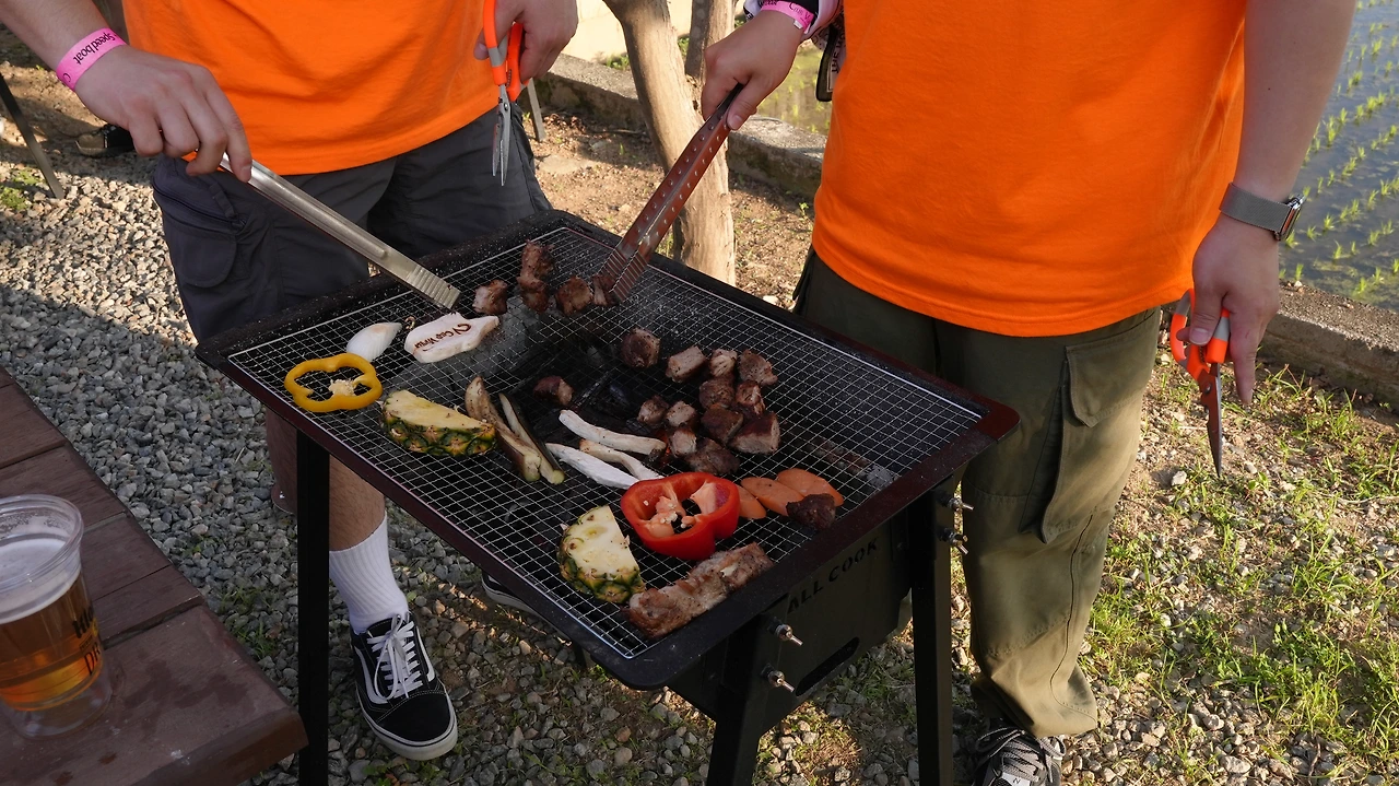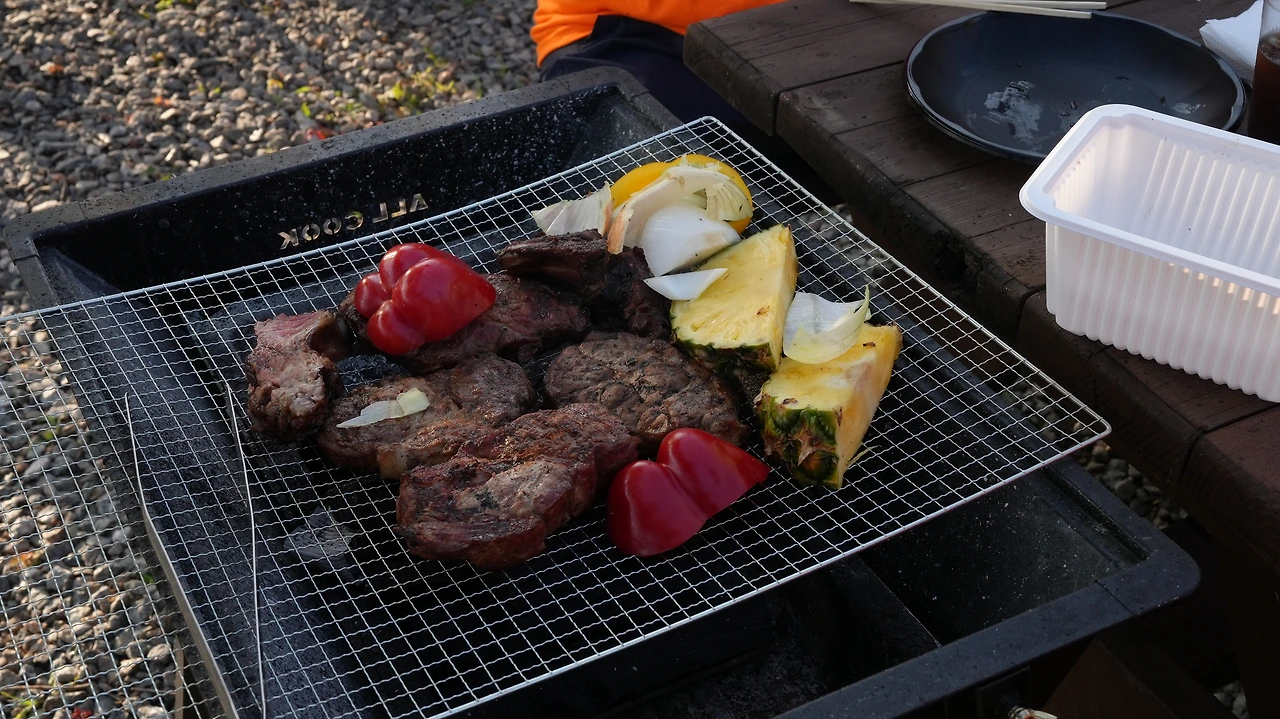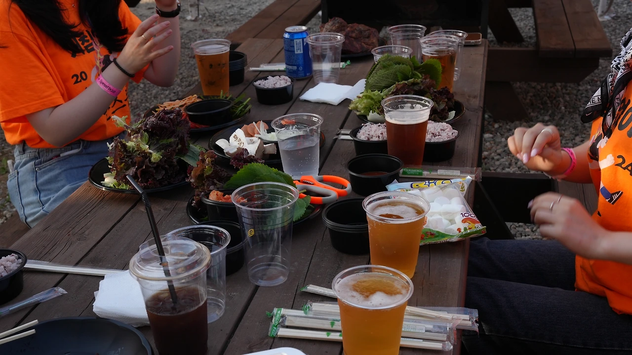 운동회가 끝난 후 허기진 구성원들을 위해 무제한 바비큐와 맥주가 준비되었어요. 다양한 부위의 고기와 쌈, 파인애플, 파프리카, 김치 등을 하나둘씩 챙겨 테이블에 둘러앉았습니다. 낮엔 덥지만 해가 질 때가 되니 야외 테이블에 앉아있기 딱 좋은 날씨라 기분 좋은 바람을 맞으며 저녁을 즐길 수 있었습니다.