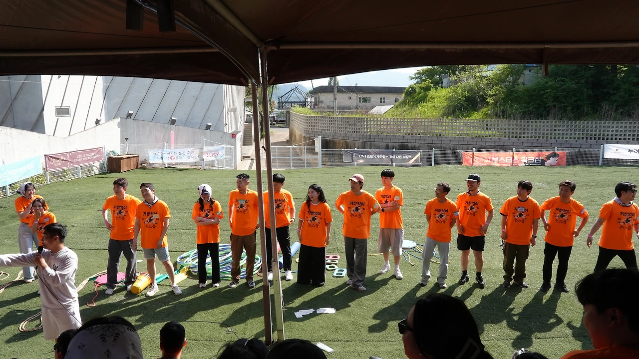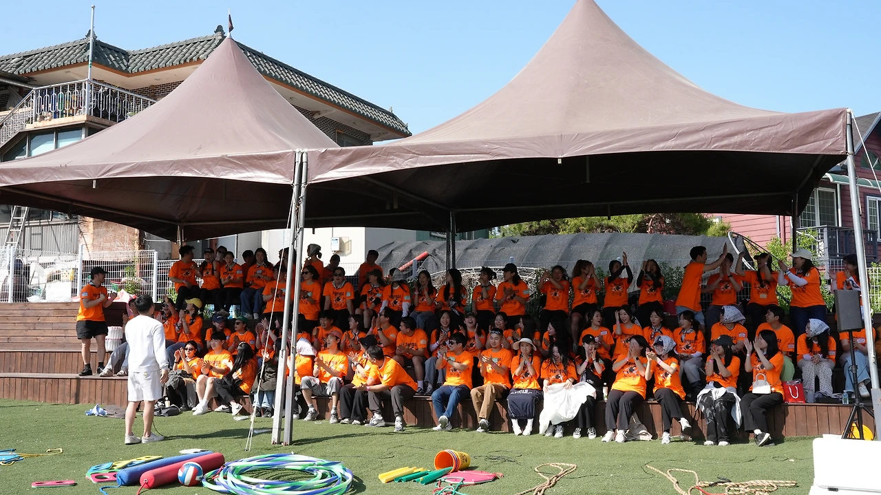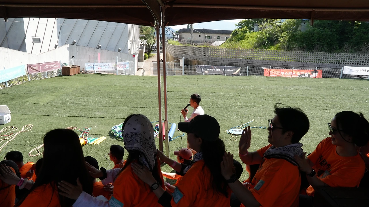부스팅데이가 끝난 후엔 다시 잠시 휴식 시간을 가지고, 이번 워크숍의 하이라이트라고 할 수 있는 운동회를 위해 운동장에 모였습니다. 날이 많이 더워 천막 아래 앉아 레크리에이션 시간을 먼저 가졌어요. 레크리에이션이라기엔 다들 에너지가 어마어마해서 벌써부터 운동회가 시작된 것 같았습니다.